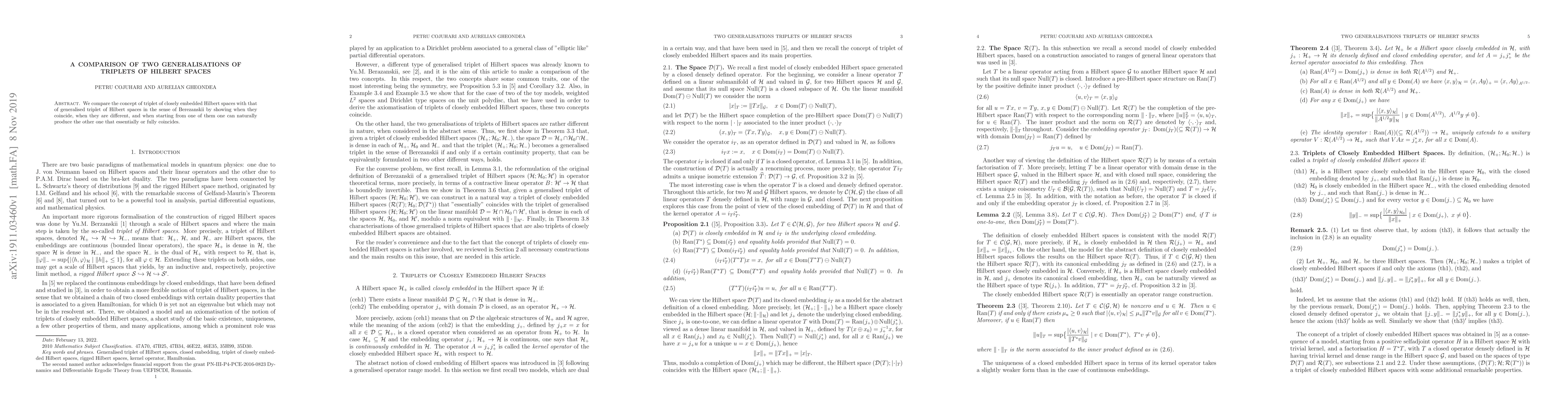 We compare the concept of triplet of closely embedded Hilbert spaces with that of generalised triplet of Hilbert spaces in the sense of Berezanskii by showing when they coincide, when they are different, and when starting from one of them one can naturally produce the other one that essentially or fully coincides.