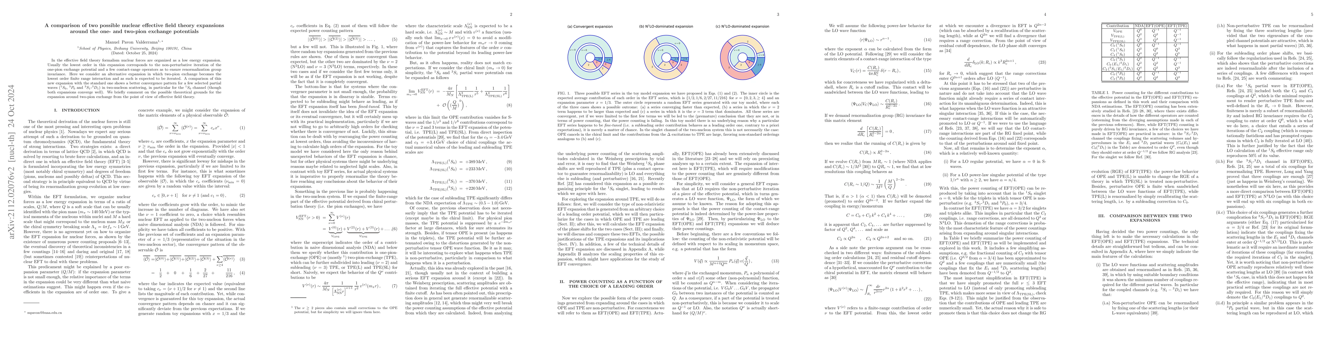 This paper compares two nuclear effective field theory expansions: one based on one-pion exchange and the other on two-pion exchange. The two-pion exchange expansion shows better convergence for selected partial waves in two-nucleon scattering, especially for the $^1S_0$ channel, while both expansions perform well overall.