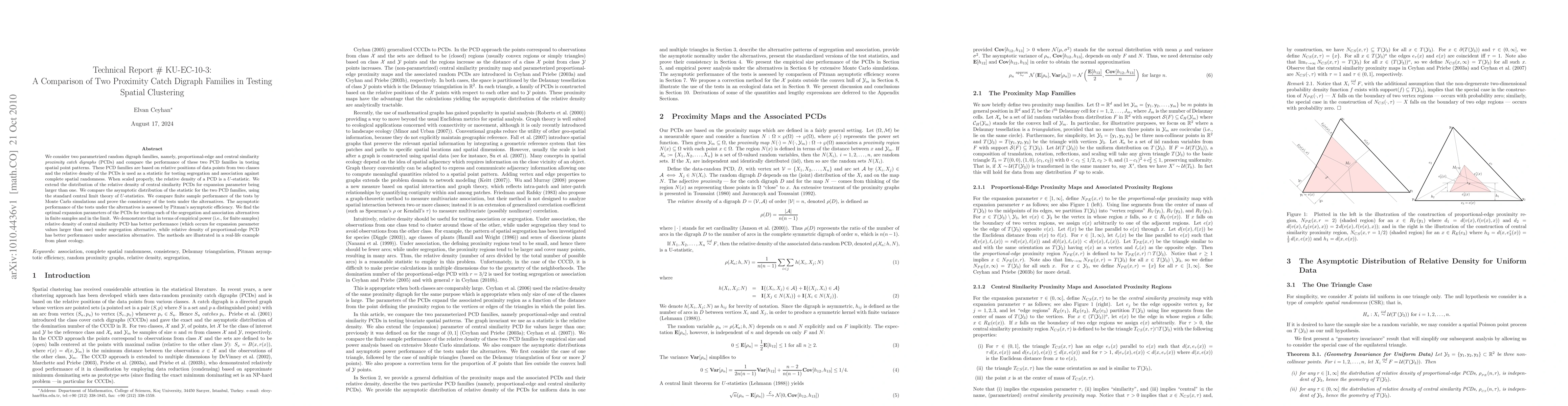 This paper compares two types of proximity catch digraph families—proportional-edge and central similarity—for testing spatial clustering. It finds that central similarity PCDs perform better for segregation tests, while proportional-edge PCDs are more effective for association tests, with both methods validated through Monte Carlo simulations and real-life ecological data.