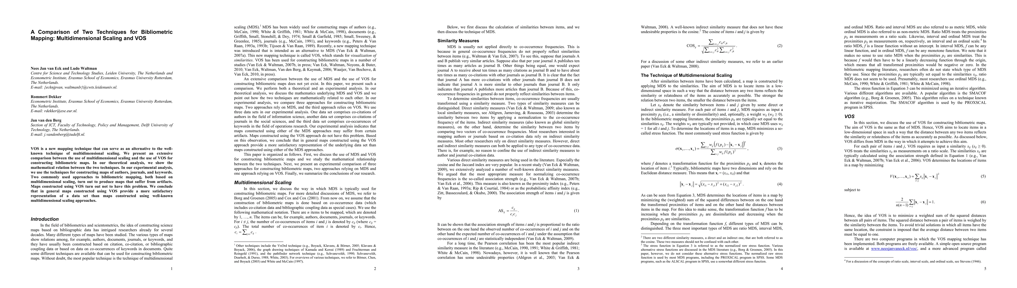 This paper compares bibliometric mapping techniques, specifically multidimensional scaling and VOS, showing that VOS provides a more accurate representation of data sets compared to multidimensional scaling, which often produces maps with artifacts. The study concludes that VOS is a superior alternative for constructing bibliometric maps.