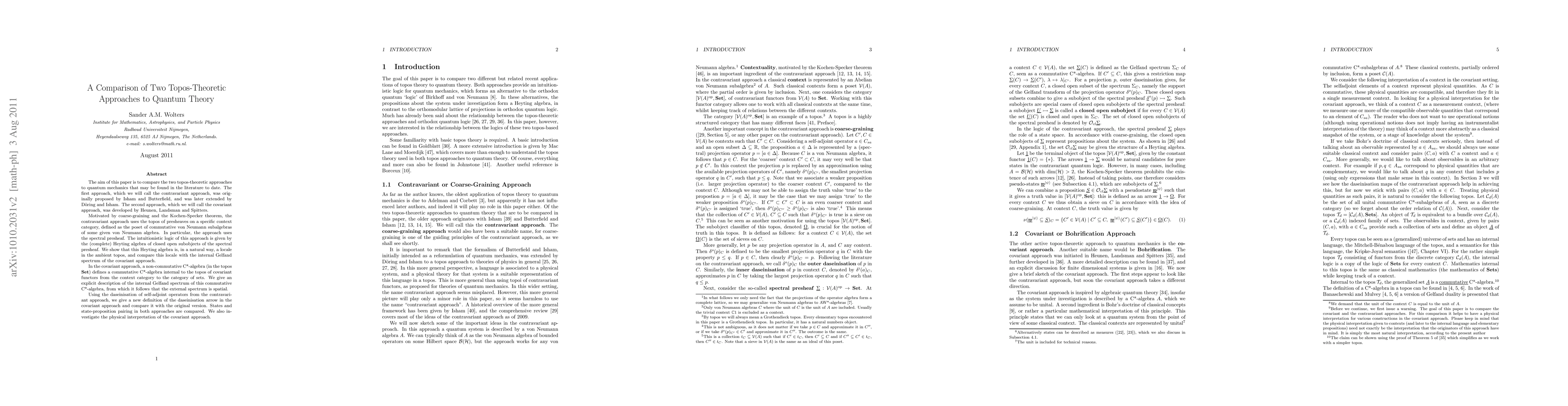 The aim of this paper is to compare the two topos-theoretic approaches to quantum mechanics that may be found in the literature to date. The first approach, which we will call the contravariant approach, was originally proposed by Isham and Butterfield, and was later extended by Doering and Isham. The second approach, which we will call the covariant approach, was developed by Heunen, Landsman and Spitters. Motivated by coarse-graining and the Kochen-Specker theorem, the contravariant approach uses the topos of presheaves on a specific context category, defined as the poset of commutative von Neumann subalgebras of some given von Neumann algebra. In particular, the approach uses the spectral presheaf. The intuitionistic logic of this approach is given by the (complete) Heyting algebra of closed open subob jects of the spectral presheaf. We show that this Heyting algebra is, in a natural way, a locale in the ambient topos, and compare this locale with the internal Gelfand spectrum of the covariant approach. In the covariant approach, a non-commutative C*-algebra (in the topos Set) defines a commutative C*-algebra internal to the topos of covariant functors from the context category to the category of sets. We give an explicit description of the internal Gelfand spectrum of this commutative C*-algebra, from which it follows that the external spectrum is spatial. Using the daseinisation of self-adjoint operators from the contravariant approach, we give a new definition of the daseinisation arrow in the covariant approach and compare it with the original version. States and state-proposition pairing in both approaches are compared. We also investigate the physical interpretation of the covariant approach.