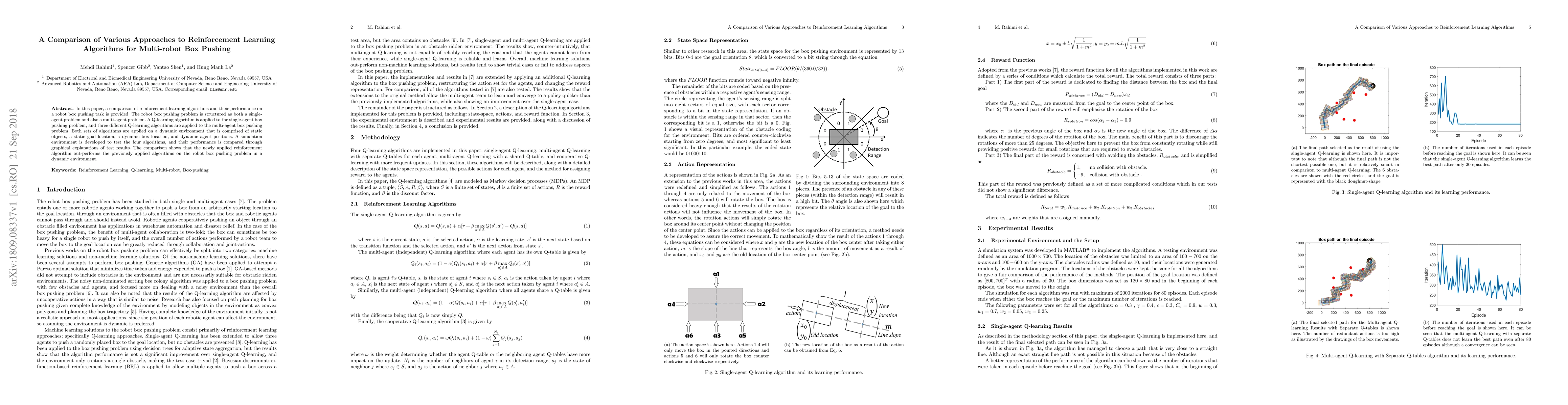 In this paper, a comparison of reinforcement learning algorithms and their performance on a robot box pushing task is provided. The robot box pushing problem is structured as both a single-agent problem and also a multi-agent problem. A Q-learning algorithm is applied to the single-agent box pushing problem, and three different Q-learning algorithms are applied to the multi-agent box pushing problem. Both sets of algorithms are applied on a dynamic environment that is comprised of static objects, a static goal location, a dynamic box location, and dynamic agent positions. A simulation environment is developed to test the four algorithms, and their performance is compared through graphical explanations of test results. The comparison shows that the newly applied reinforcement algorithm out-performs the previously applied algorithms on the robot box pushing problem in a dynamic environment.