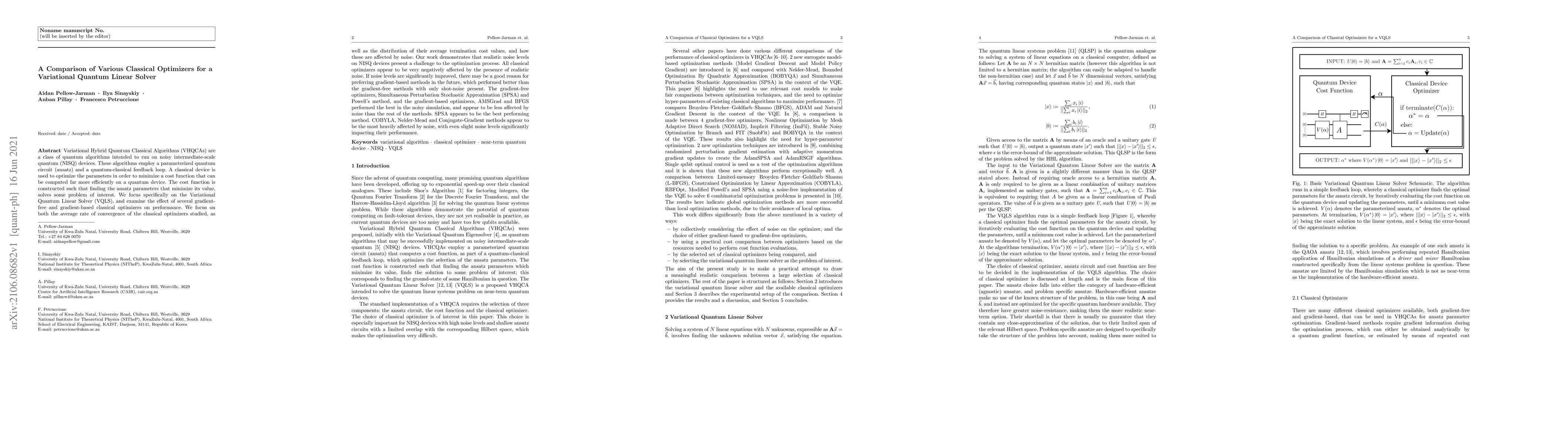 This paper compares various classical optimizers for the Variational Quantum Linear Solver, finding that gradient-free methods like SPSA and Powell's method, and gradient-based methods like AMSGrad and BFGS perform best under realistic noise levels on NISQ devices. SPSA emerges as the top performer, while Conjugate-Gradient, Nelder-Mead, and COBYLA are most adversely affected by noise.