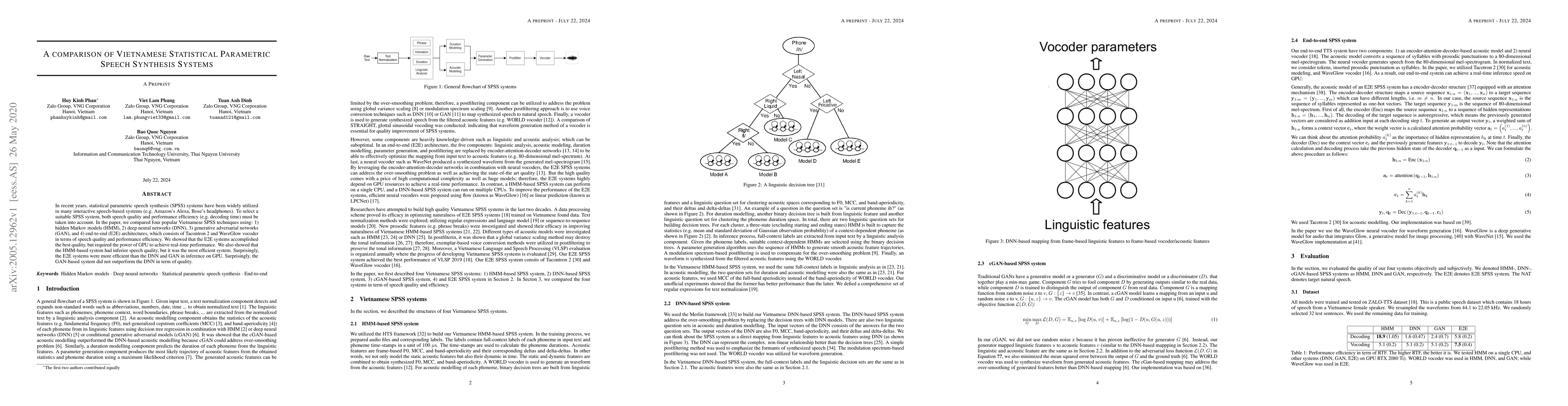 This paper compares four Vietnamese SPSS techniques—HMM, DNN, GAN, and E2E—evaluating speech quality and performance efficiency. The E2E system achieved the best quality but needed GPU power for real-time performance, while the HMM system was the most efficient but had inferior quality.