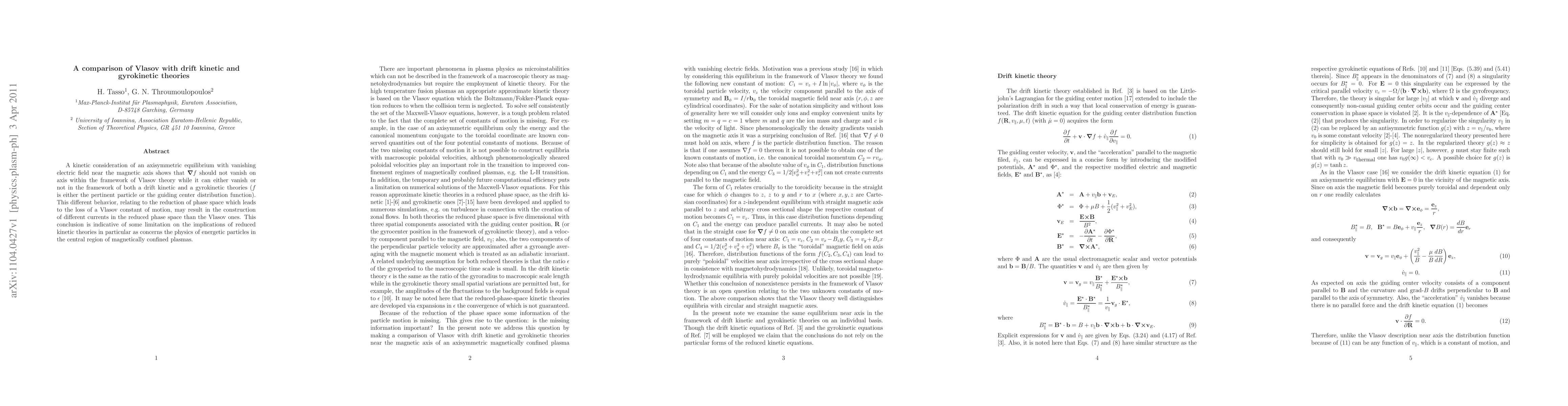 A kinetic consideration of an axisymmetric equilibrium with vanishing electric field near the magnetic axis shows that del f should not vanish on axis within the framework of Vlasov theory while it can either vanish or not in the framework of both a drift kinetic and a gyrokinetic theories (f is either the pertinent particle or the guiding center distribution function). This different behavior, relating to the reduction of phase space which leads to the loss of a Vlasov constant of motion, may result in the construction of different currents in the reduced phase space than the Vlasov ones. This conclusion is indicative of some limitation on the implications of reduced kinetic theories in particular as concerns the physics of energetic particles in the central region of magnetically confined plasmas.