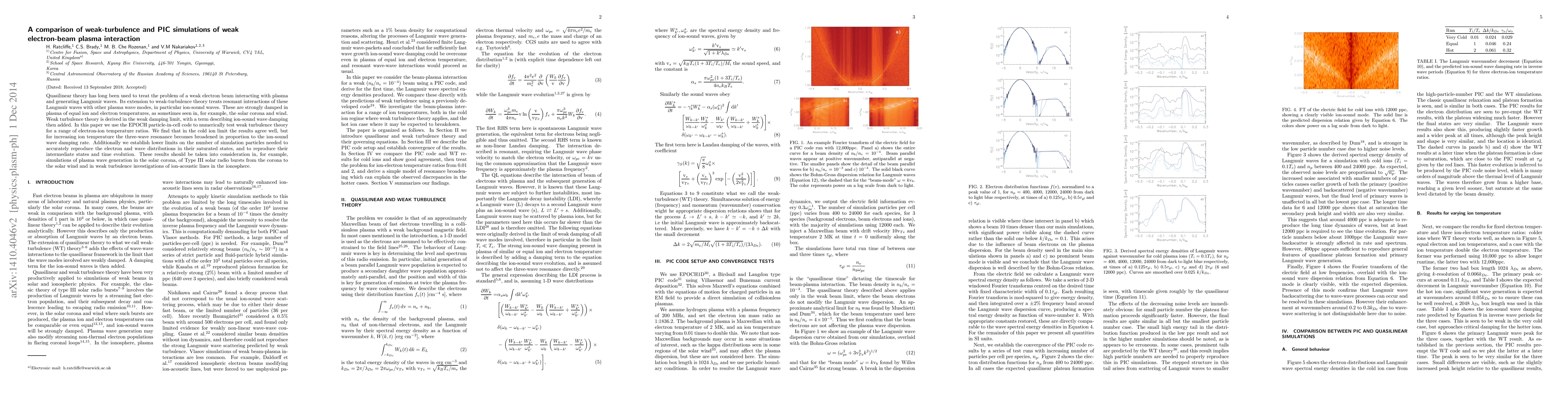 This paper compares weak-turbulence theory and particle-in-cell simulations for weak electron-beam plasma interactions, finding good agreement in cold ion conditions but broader three-wave resonance with increasing ion temperature due to ion-sound wave damping, which may impact solar radio burst theory. It also establishes minimum particle requirements for accurate simulations.