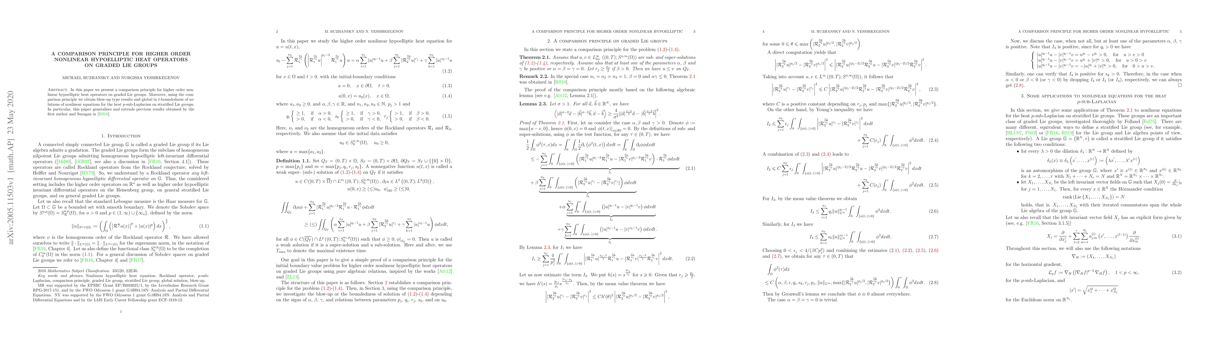 This paper establishes a comparison principle for higher order nonlinear hypoelliptic heat operators on graded Lie groups, leading to blow-up type results and global in t-boundedness of solutions for the heat p-sub-Laplacian.