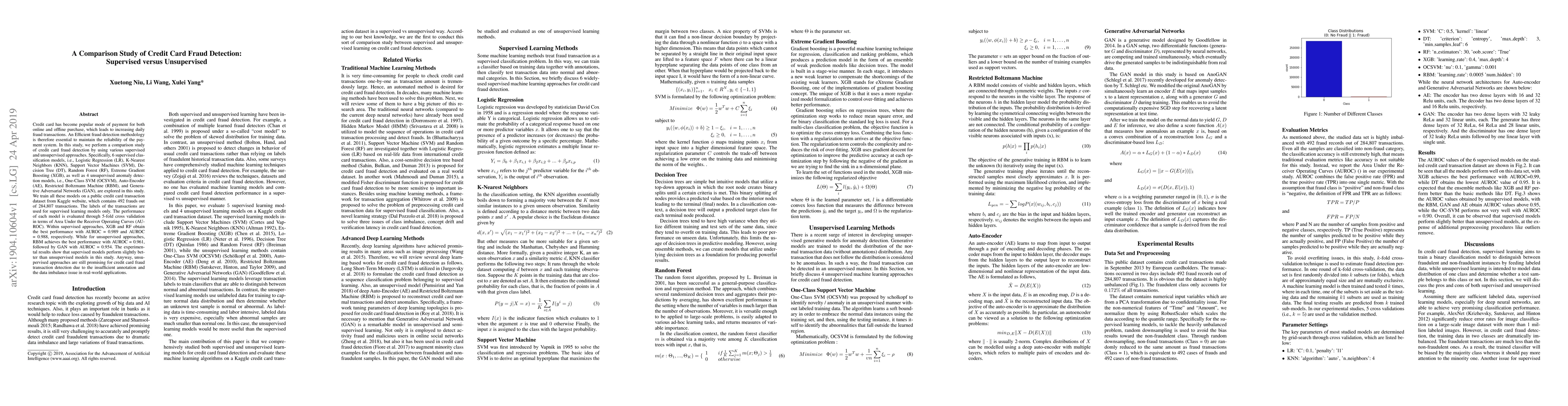 This study compares the performance of six supervised and four unsupervised models for credit card fraud detection. Supervised models (Logistic Regression, KNN, SVM, DT, RF, XGB) and unsupervised models (OCSVM, AE, RBM, GAN) were evaluated on a Kaggle dataset with 284,807 transactions, of which 492 were fraudulent. Supervised models, particularly XGB and RF, outperformed unsupervised models, though RBM showed the best performance among the unsupervised approaches.
