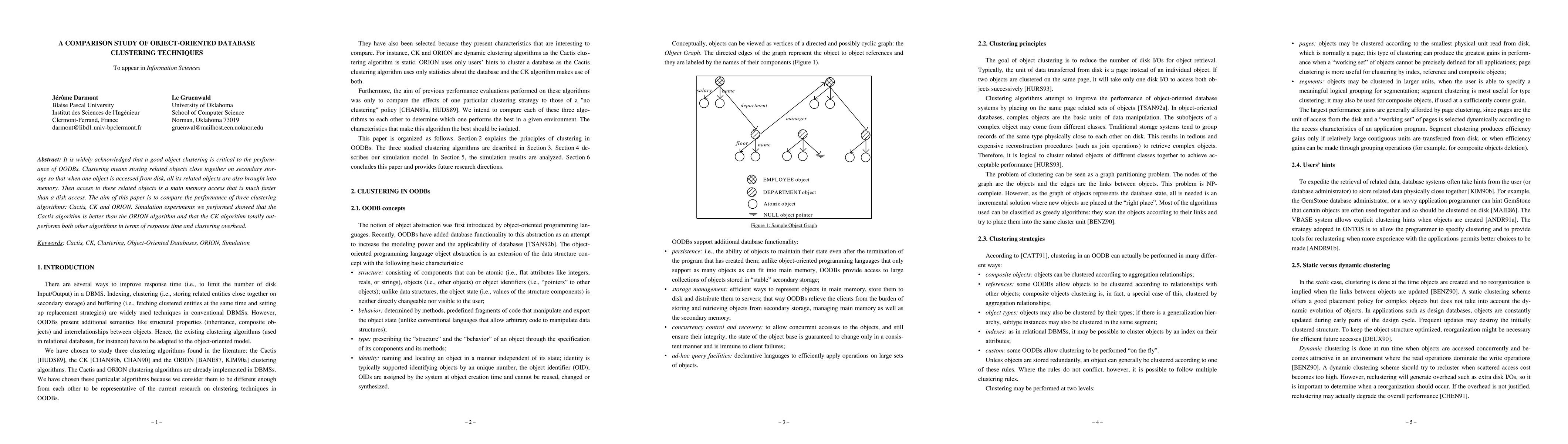 It is widely acknowledged that a good object clustering is critical to the performance of OODBs. Clustering means storing related objects close together on secondary storage so that when one object is accessed from disk, all its related objects are also brought into memory. Then access to these related objects is a main memory access that is much faster than a disk access. The aim of this paper is to compare the performance of three clustering algorithms: Cactis, CK and ORION. Simulation experiments we performed showed that the Cactis algorithm is better than the ORION algorithm and that the CK algorithm totally out-performs both other algorithms in terms of response time and clustering overhead.