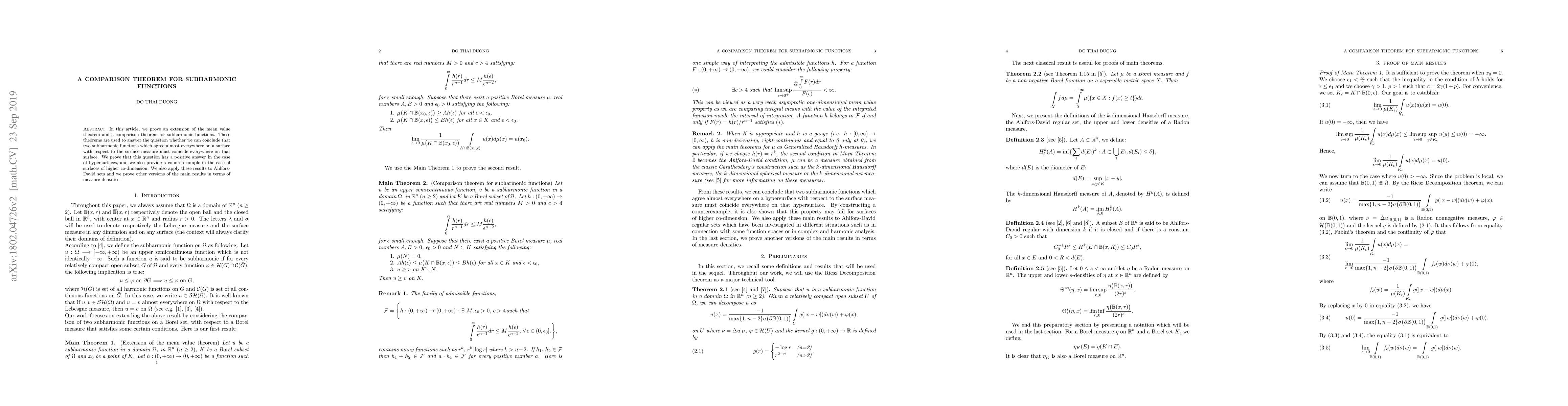 This paper extends the mean value theorem and proves a comparison theorem for subharmonic functions, demonstrating that two such functions that agree almost everywhere on a hypersurface must coincide everywhere. However, a counterexample shows this does not hold for surfaces of higher co-dimension.