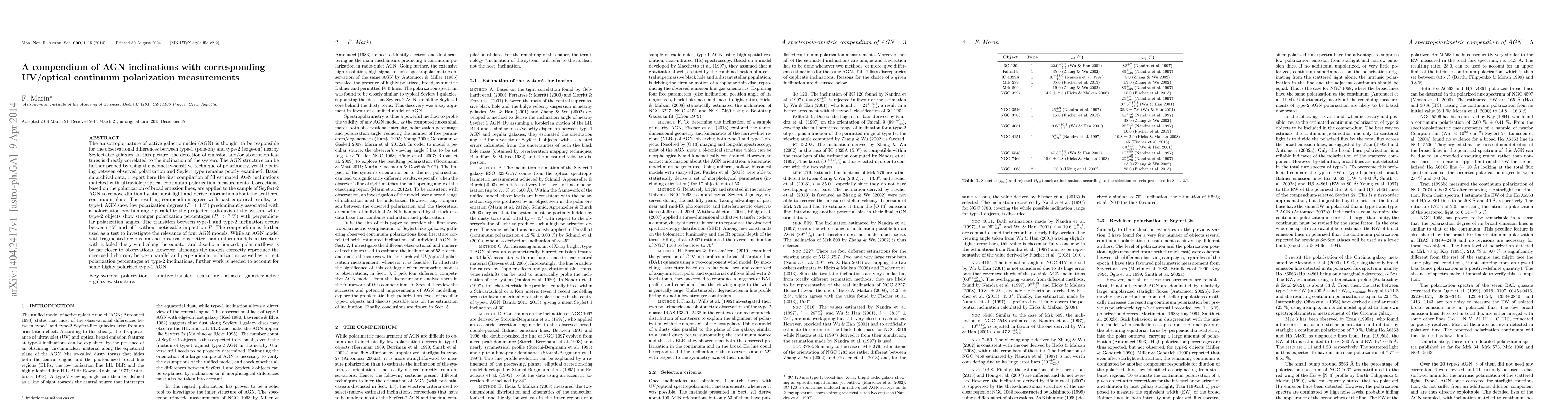 This study compiles 53 AGN inclinations with UV/optical continuum polarization measurements, revealing type-1 objects show low polarization degrees and type-2 objects show stronger polarization percentages, with a transition between 45-60 degrees.