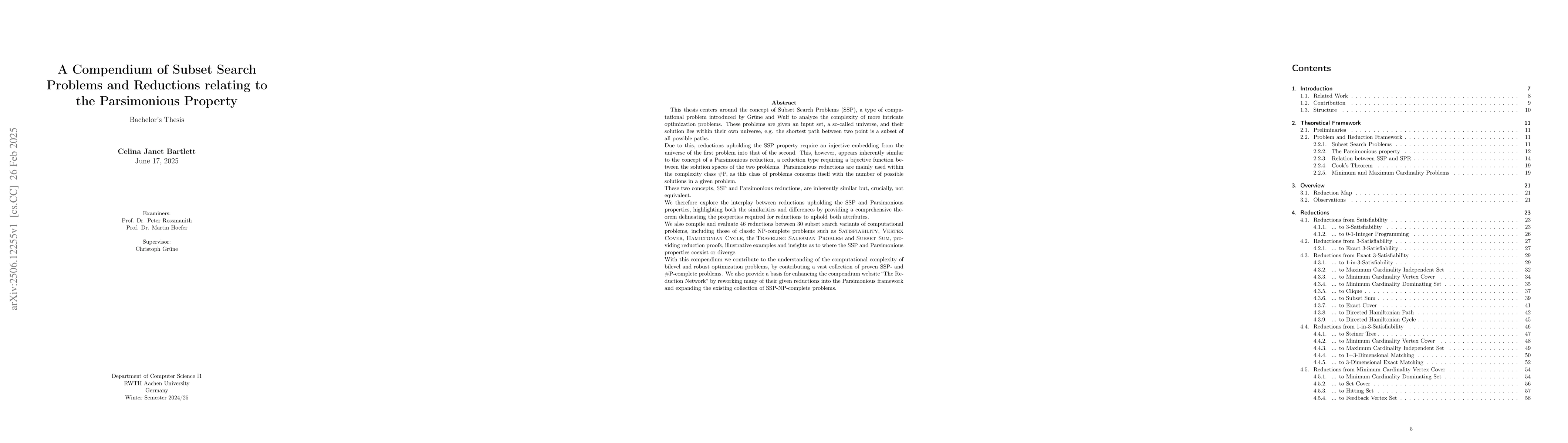 This thesis centers around the concept of Subset Search Problems (SSP), a type of computational problem introduced by Gr\"une and Wulf to analyze the complexity of more intricate optimization problems. These problems are given an input set, a so-called universe, and their solution lies within their own universe, e.g. the shortest path between two point is a subset of all possible paths. Due to this, reductions upholding the SSP property require an injective embedding from the universe of the first problem into that of the second. This, however, appears inherently similar to the concept of a Parsimonious reduction, a reduction type requiring a bijective function between the solution spaces of the two problems. Parsimonious reductions are mainly used within the complexity class #P, as this class of problems concerns itself with the number of possible solutions in a given problem. These two concepts, SSP and Parsimonious reductions, are inherently similar but, crucially, not equivalent. We therefore explore the interplay between reductions upholding the SSP and Parsimonious properties, highlighting both the similarities and differences by providing a comprehensive theorem delineating the properties required for reductions to uphold both attributes. We also compile and evaluate 46 reductions between 30 subset search variants of computational problems, including those of classic NP-complete problems such as Satisfiability, Vertex Cover, Hamiltonian Cycle, the Traveling Salesman Problem and Subset Sum, providing reduction proofs, illustrative examples and insights as to where the SSP and Parsimonious properties coexist or diverge. With this compendium we contribute to the understanding of the computational complexity of bilevel and robust optimization problems, by contributing a vast collection of proven SSP- and #P-complete problems.
