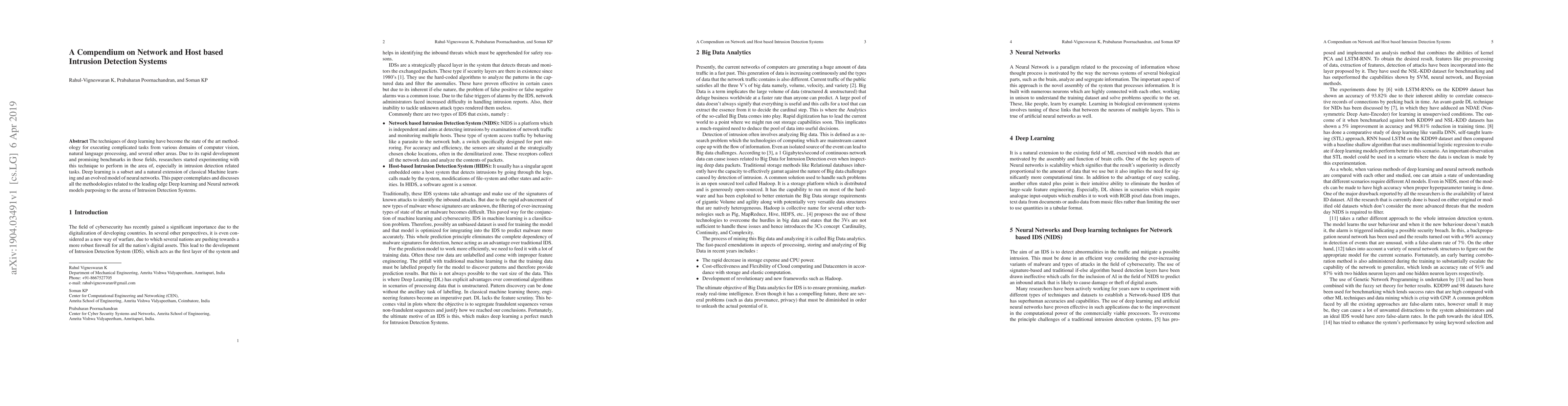The techniques of deep learning have become the state of the art methodology for executing complicated tasks from various domains of computer vision, natural language processing, and several other areas. Due to its rapid development and promising benchmarks in those fields, researchers started experimenting with this technique to perform in the area of, especially in intrusion detection related tasks. Deep learning is a subset and a natural extension of classical Machine learning and an evolved model of neural networks. This paper contemplates and discusses all the methodologies related to the leading edge Deep learning and Neural network models purposing to the arena of Intrusion Detection Systems.