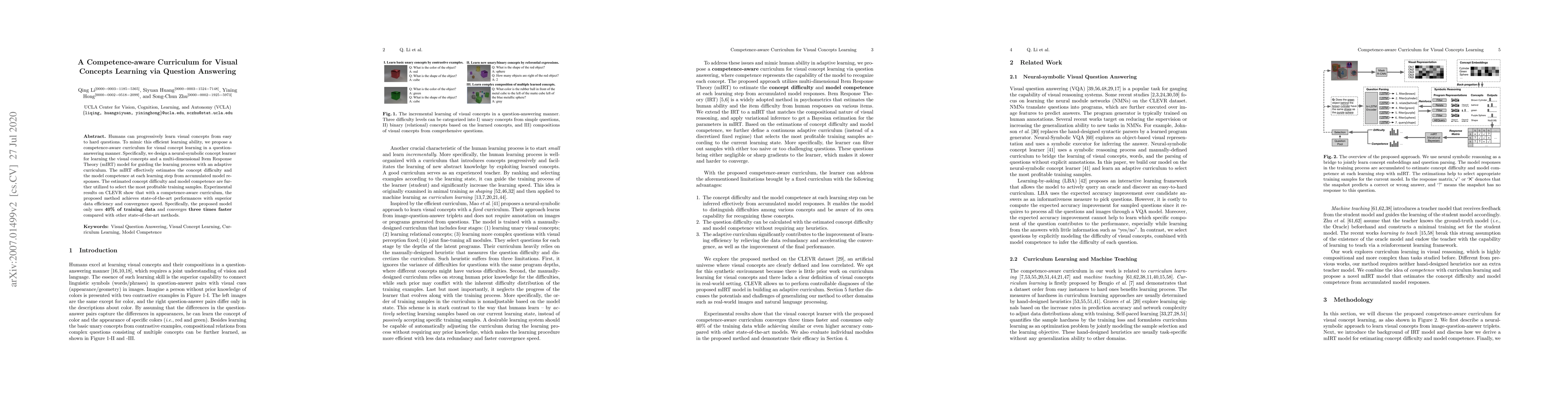 This paper proposes a competence-aware curriculum for visual concept learning through question answering, utilizing a neural-symbolic learner and a multi-dimensional Item Response Theory model. The method achieves state-of-the-art performance with significantly improved data efficiency and faster convergence, using only 40% of training data compared to other methods.