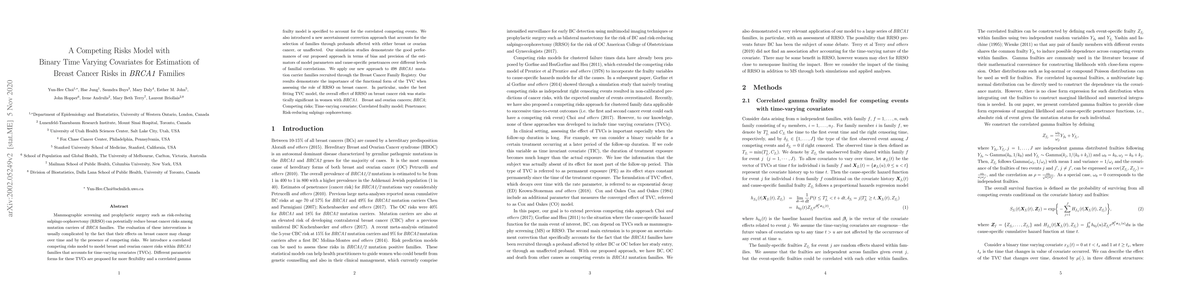 Mammographic screening and prophylactic surgery such as risk-reducing salpingo oophorectomy (RRSO) can potentially reduce breast cancer risks among mutation carriers of BRCA families. The evaluation of these interventions is usually complicated by the fact that their effects on breast cancer may change over time and by the presence of competing risks. We introduce a correlated competing risks model to model breast and ovarian cancer risks within BRCA1 families that accounts for time-varying covariates (TVCs). Different parametric forms for these TVCs are proposed for more flexibility and a correlated gamma frailty model is specified to account for the correlated competing events. We also introduced a new ascertainment correction approach that accounts for the selection of families through probands affected with either breast or ovarian cancer, or unaffected. Our simulation studies demonstrate the good performances of our proposed approach in terms of bias and precision of the estimators of model parameters and cause-specific penetrances over different levels of familial correlations. We apply our new approach to 498 BRCA1 mutation carrier families recruited through the Breast Cancer Family Registry. Our results demonstrate the importance of the functional form of the TVC when assessing the role of RRSO on breast cancer. In particular, under the best fitting TVC model, the overall effect of RRSO on breast cancer risk was statistically significant in women with BRCA1.