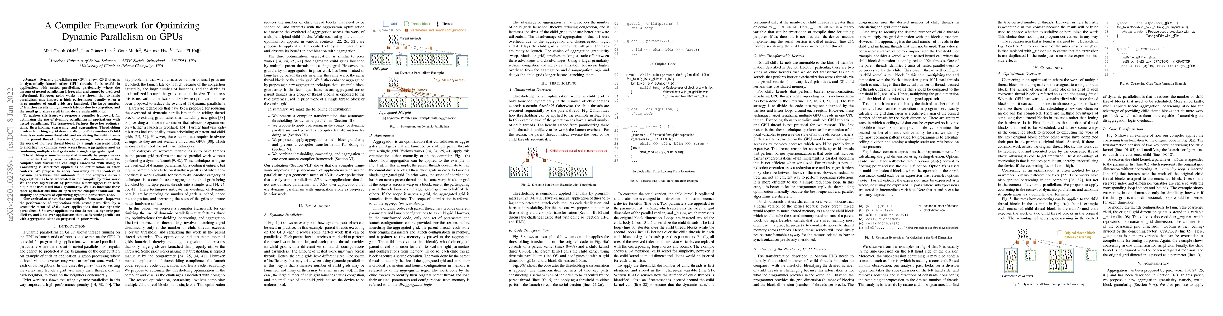 This paper proposes a compiler framework to optimize dynamic parallelism on GPUs, addressing performance penalties from irregular nested parallelism. The framework employs thresholding, coarsening, and aggregation techniques to reduce launch latency and improve hardware utilization, achieving up to 43.0x performance improvement over dynamic parallelism alone.