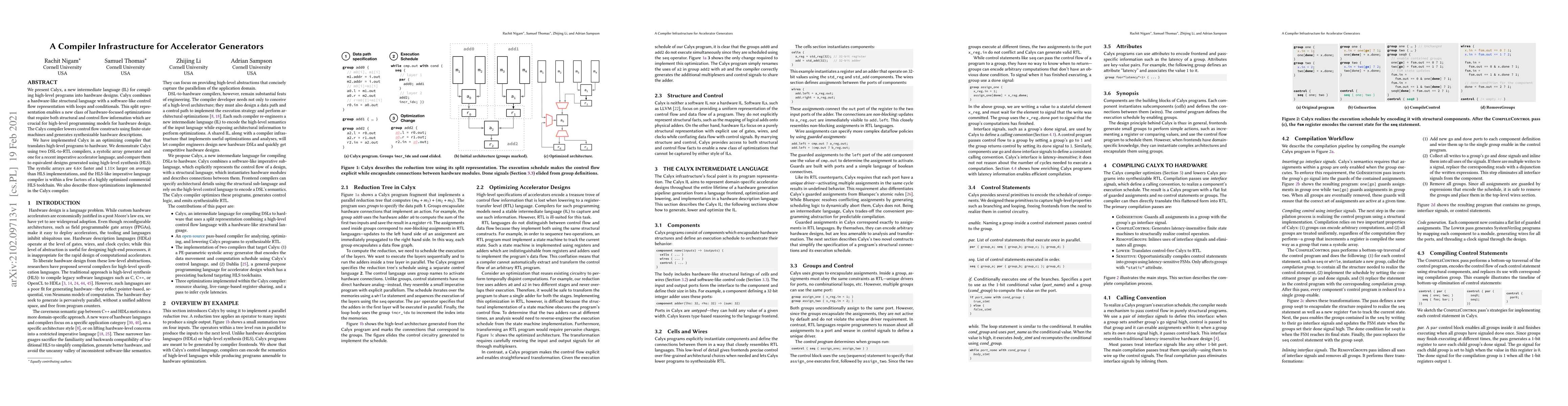 We present Calyx, a new intermediate language (IL) for compiling high-level programs into hardware designs. Calyx combines a hardware-like structural language with a software-like control flow representation with loops and conditionals. This split representation enables a new class of hardware-focused optimizations that require both structural and control flow information which are crucial for high-level programming models for hardware design. The Calyx compiler lowers control flow constructs using finite-state machines and generates synthesizable hardware descriptions. We have implemented Calyx in an optimizing compiler that translates high-level programs to hardware. We demonstrate Calyx using two DSL-to-RTL compilers, a systolic array generator and one for a recent imperative accelerator language, and compare them to equivalent designs generated using high-level synthesis (HLS). The systolic arrays are $4.6\times$ faster and $1.1\times$ larger on average than HLS implementations, and the HLS-like imperative language compiler is within a few factors of a highly optimized commercial HLS toolchain. We also describe three optimizations implemented in the Calyx compiler.