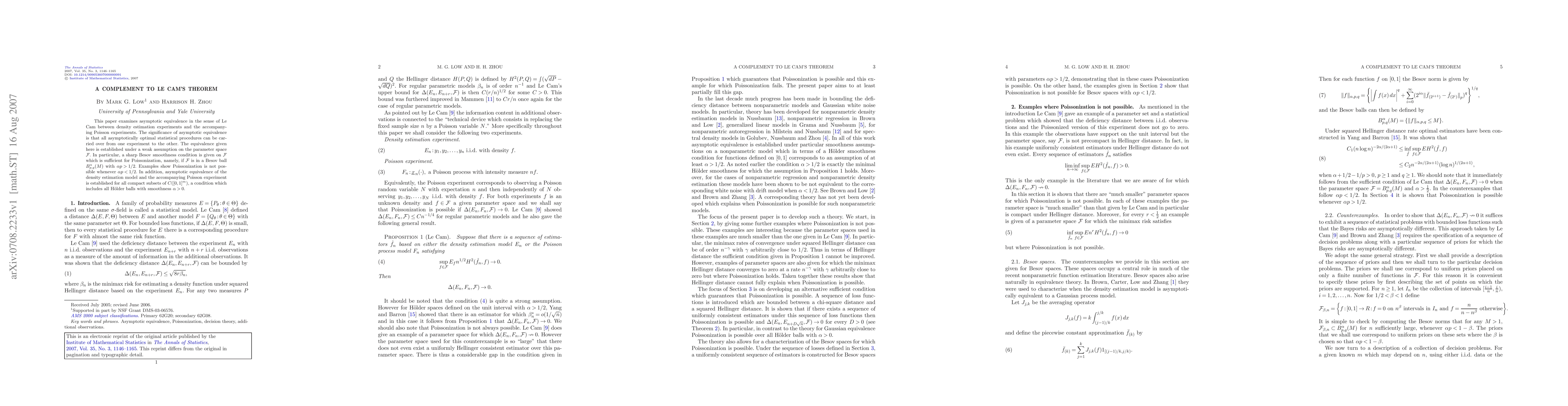 This paper examines asymptotic equivalence in the sense of Le Cam between density estimation experiments and the accompanying Poisson experiments. The significance of asymptotic equivalence is that all asymptotically optimal statistical procedures can be carried over from one experiment to the other. The equivalence given here is established under a weak assumption on the parameter space $\mathcal{F}$. In particular, a sharp Besov smoothness condition is given on $\mathcal{F}$ which is sufficient for Poissonization, namely, if $\mathcal{F}$ is in a Besov ball $B_{p,q}^{\alpha}(M)$ with $\alpha p>1/2$. Examples show Poissonization is not possible whenever $\alpha p<1/2$. In addition, asymptotic equivalence of the density estimation model and the accompanying Poisson experiment is established for all compact subsets of $C([0,1]^m)$, a condition which includes all H\"{o}lder balls with smoothness $\alpha>0$.