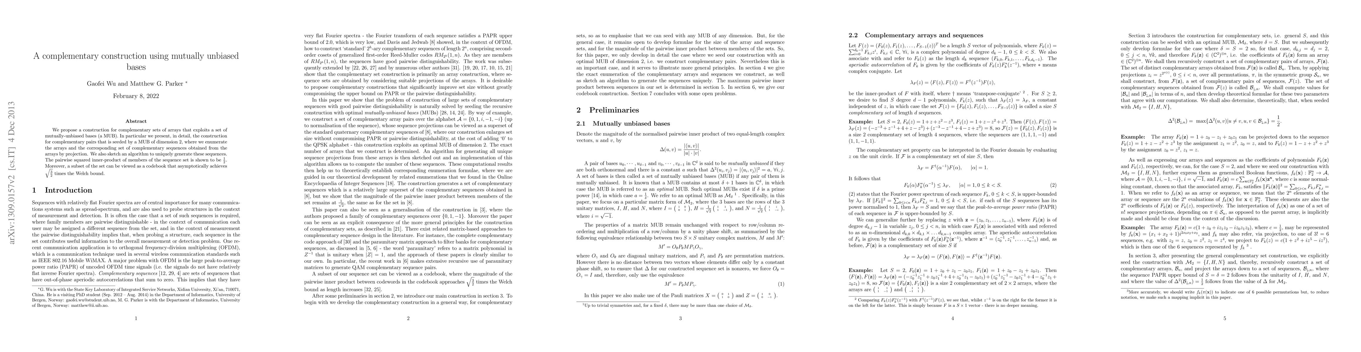 This paper presents a method to generate complementary pairs of arrays using mutually unbiased bases, achieving a low pairwise squared inner-product of 1/2 and asymptotically approaching the Welch bound with a factor of sqrt(3/2).