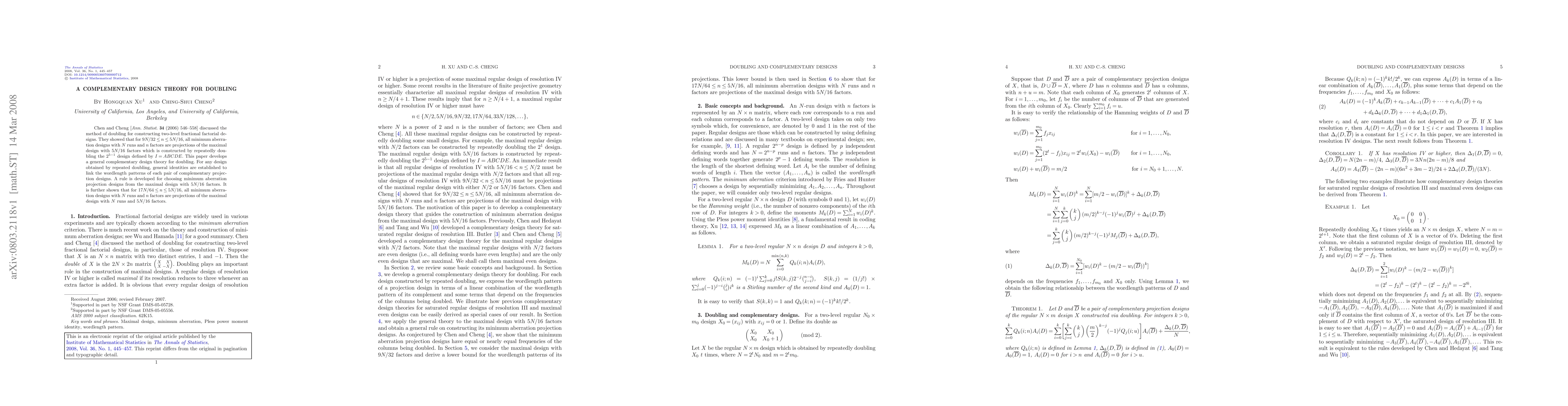 Chen and Cheng [Ann. Statist. 34 (2006) 546--558] discussed the method of doubling for constructing two-level fractional factorial designs. They showed that for $9N/32\le n\le 5N/16$, all minimum aberration designs with $N$ runs and $n$ factors are projections of the maximal design with $5N/16$ factors which is constructed by repeatedly doubling the $2^{5-1}$ design defined by $I=ABCDE$. This paper develops a general complementary design theory for doubling. For any design obtained by repeated doubling, general identities are established to link the wordlength patterns of each pair of complementary projection designs. A rule is developed for choosing minimum aberration projection designs from the maximal design with $5N/16$ factors. It is further shown that for $17N/64\le n\le 5N/16$, all minimum aberration designs with $N$ runs and $n$ factors are projections of the maximal design with $N$ runs and $5N/16$ factors.