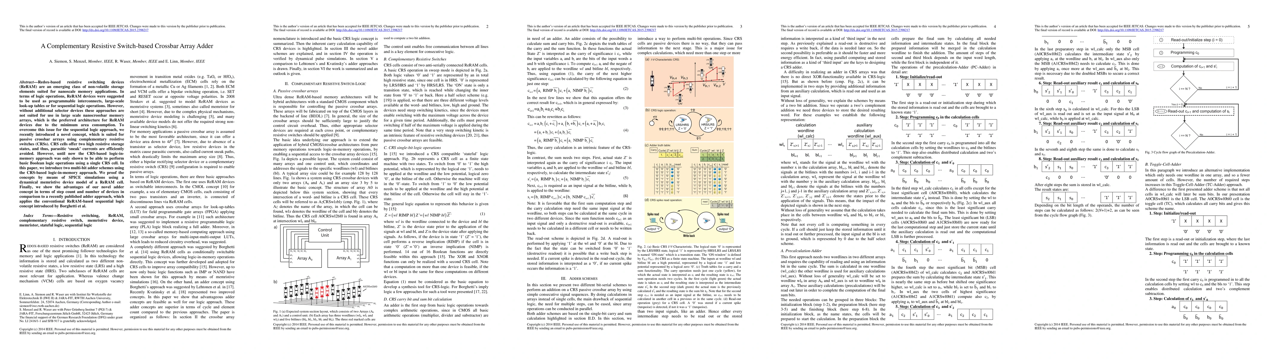 This paper proposes two multi-bit adder schemes utilizing complementary resistive switches (CRSs) in a crossbar array, demonstrating efficient logic-in-memory operations to avoid parasitic sneak currents. The concepts are validated through SPICE simulations, showing advantages over conventional ReRAM-based sequential logic adders in terms of step count and device count.