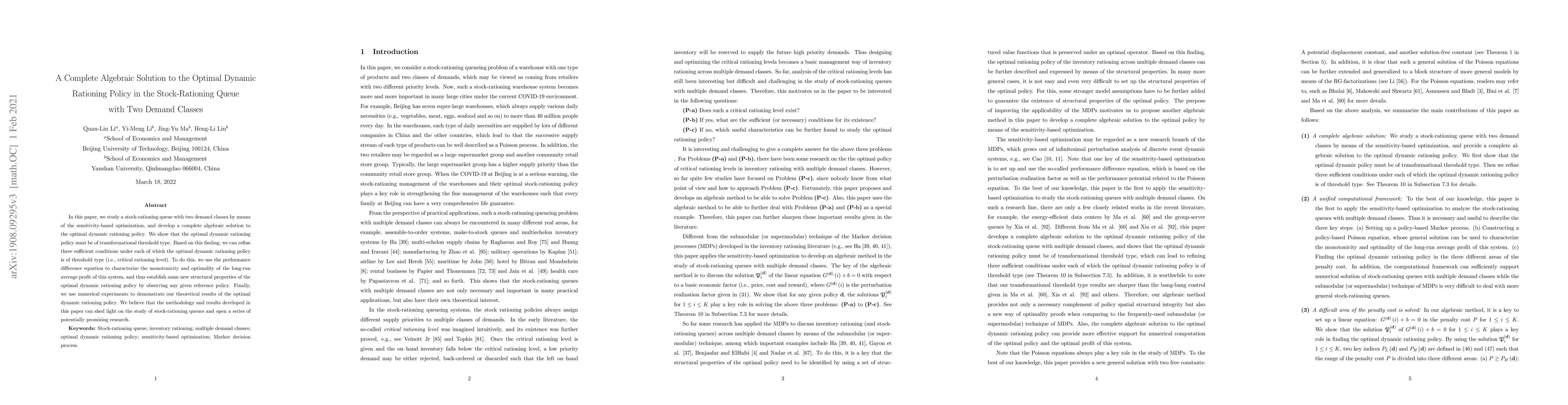 Researchers develop a complete algebraic solution to optimal dynamic rationing policy in stock-rationing queues with two demand classes, finding that the policy must be of transformational threshold type.
