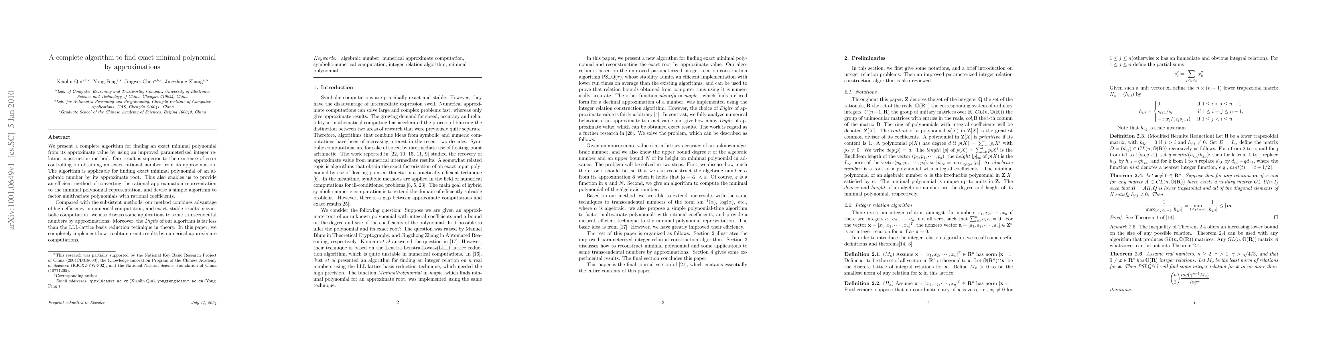 We present a complete algorithm for finding an exact minimal polynomial from its approximate value by using an improved parameterized integer relation construction method. Our result is superior to the existence of error controlling on obtaining an exact rational number from its approximation. The algorithm is applicable for finding exact minimal polynomial of an algebraic number by its approximate root. This also enables us to provide an efficient method of converting the rational approximation representation to the minimal polynomial representation, and devise a simple algorithm to factor multivariate polynomials with rational coefficients. Compared with the subsistent methods, our method combines advantage of high efficiency in numerical computation, and exact, stable results in symbolic computation. we also discuss some applications to some transcendental numbers by approximations. Moreover, the Digits of our algorithm is far less than the LLL-lattice basis reduction technique in theory. In this paper, we completely implement how to obtain exact results by numerical approximate computations.
