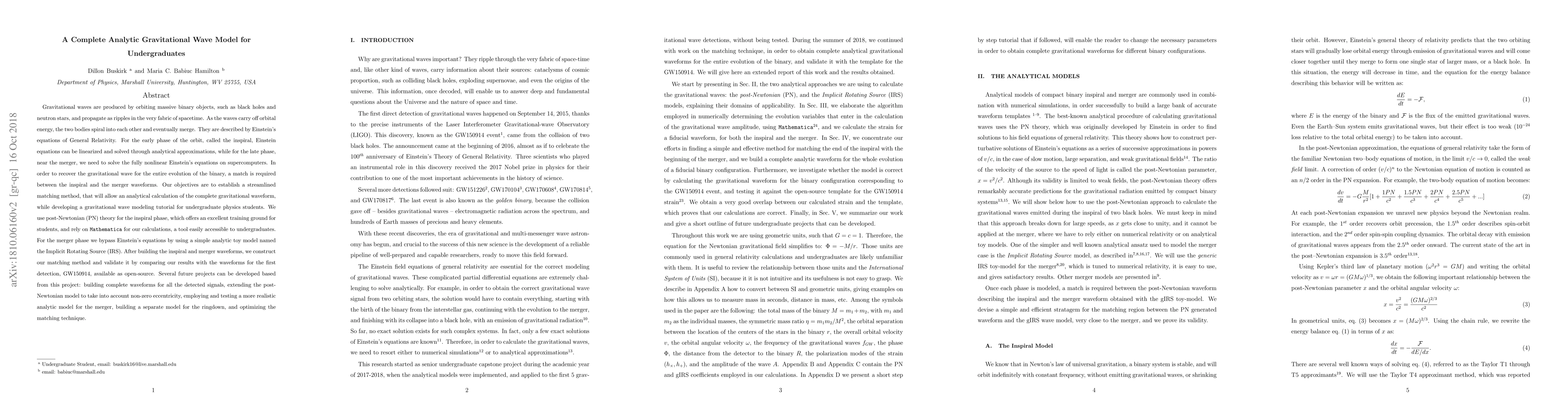 Gravitational waves are produced by orbiting massive binary objects, such as black holes and neutron stars, and propagate as ripples in the very fabric of spacetime. As the waves carry off orbital energy, the two bodies spiral into each other and eventually merge. They are described by Einstein's equations of General Relativity. For the early phase of the orbit, called the inspiral, Einstein equations can be linearized and solved through analytical approximations, while for the late phase, near the merger, we need to solve the fully nonlinear Einstein's equations on supercomputers. In order to recover the gravitational wave for the entire evolution of the binary, a match is required between the inspiral and the merger waveforms. Our objectives are to establish a streamlined matching method, that will allow an analytical calculation of the complete gravitational waveform, while developing a gravitational wave modeling tutorial for undergraduate physics students. We use post-Newtonian (PN) theory for the inspiral phase, which offers an excellent training ground for students, and rely on Mathematica for our calculations, a tool easily accessible to undergraduates. For the merger phase we bypass Einstein's equations by using a simple analytic toy model named the Implicit Rotating Source (IRS). After building the inspiral and merger waveforms, we construct our matching method and validate it by comparing our results with the waveforms for the first detection, GW150914, available as open-source. Several future projects can be developed based from this project: building complete waveforms for all the detected signals, extending the post-Newtonian model to take into account non-zero eccentricity, employing and testing a more realistic analytic model for the merger, building a separate model for the ringdown, and optimizing the matching technique.