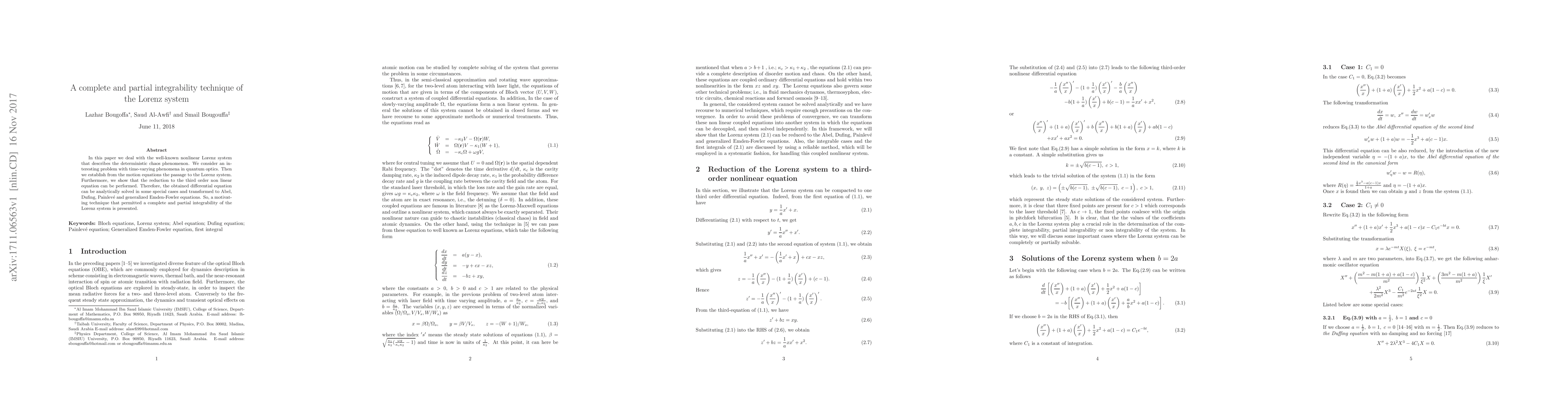 In this paper we deal with the well-known nonlinear Lorenz system that describes the deterministic chaos phenomenon. We consider an interesting problem with time-varying phenomena in quantum optics. Then we establish from the motion equations the passage to the Lorenz system. Furthermore, we show that the reduction to the third order non linear equation can be performed. Therefore, the obtained differential equation can be analytically solved in some special cases and transformed to Abel, Dufing, Painlev\'{e} and generalized Emden-Fowler equations. So, a motivating technique that permitted a complete and partial integrability of the Lorenz system is presented.