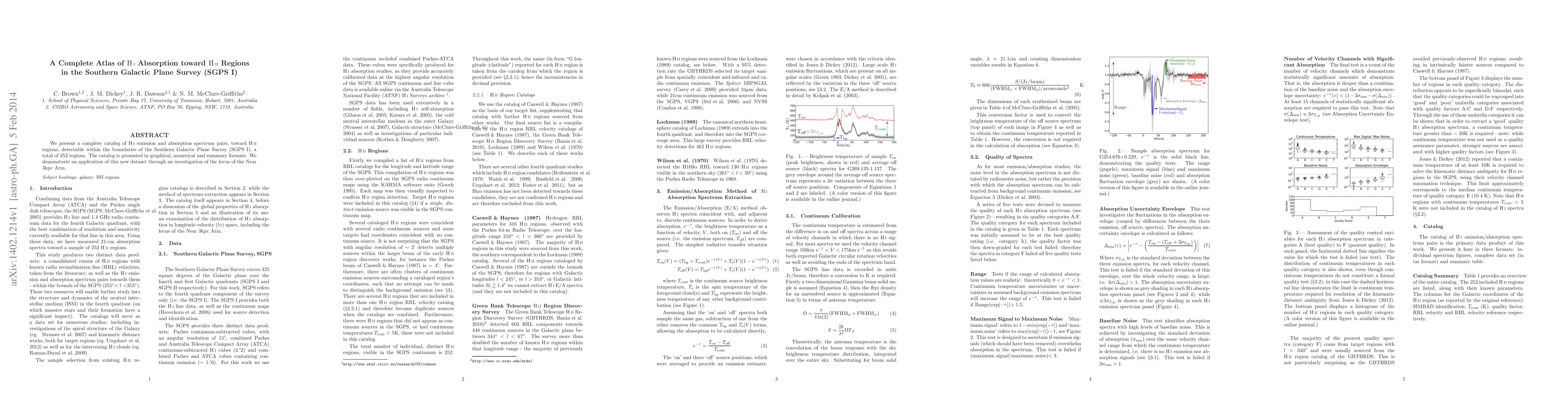 This paper provides a comprehensive catalog of H I emission and absorption spectrum pairs toward 252 H II regions within the Southern Galactic Plane Survey (SGPS I), offering graphical, numerical, and summary formats. The study also applies this dataset to investigate the Near 3kpc Arm.