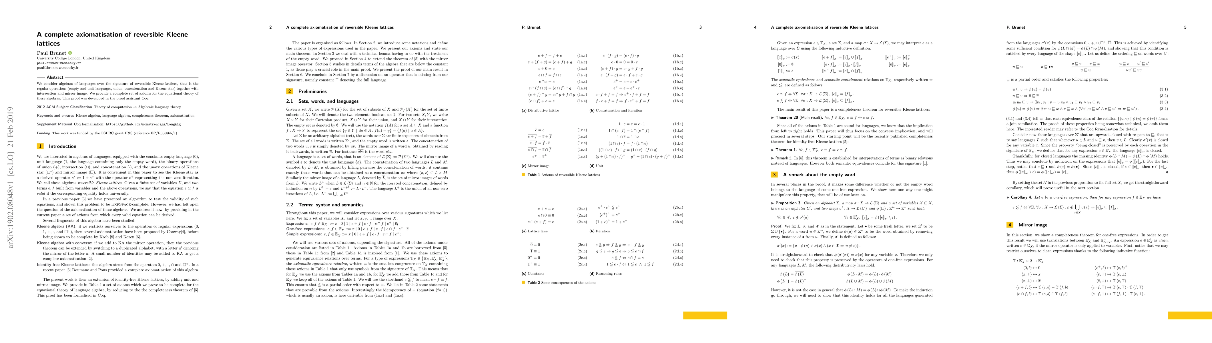 This paper presents a complete axiomatisation for reversible Kleene lattices, which include regular language operations and additional functions like intersection and mirror image. The authors developed this axiomatisation using the Coq proof assistant.