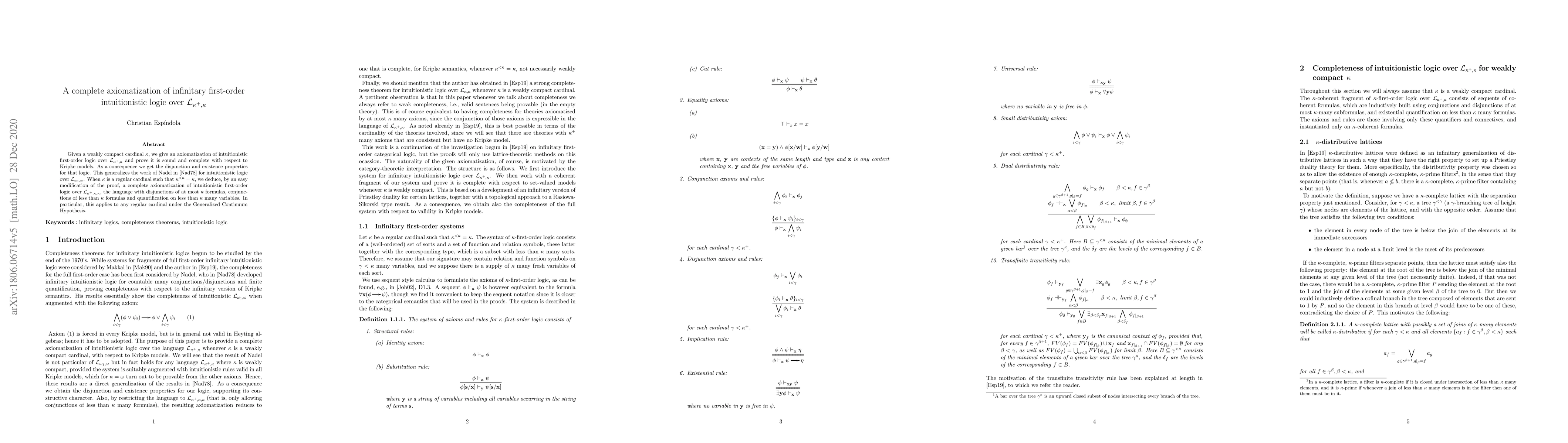 Given a weakly compact cardinal $\kappa$, we give an axiomatization of intuitionistic first-order logic over $\mathcal{L}_{\kappa^+, \kappa}$ and prove it is sound and complete with respect to Kripke models. As a consequence we get the disjunction and existence properties for that logic. This generalizes the work of Nadel for intuitionistic logic over $\mathcal{L}_{\omega_1, \omega}$. When $\kappa$ is a regular cardinal such that $\kappa^{<\kappa}=\kappa$, we deduce, by an easy modification of the proof, a complete axiomatization of intuitionistic first-order logic over $\mathcal{L}_{\kappa^+, \kappa, \kappa}$, the language with disjunctions of at most $\kappa$ formulas, conjunctions of less than $\kappa$ formulas and quantification on less than $\kappa$ many variables. In particular, this applies to any regular cardinal under the Generalized Continuum Hypothesis.