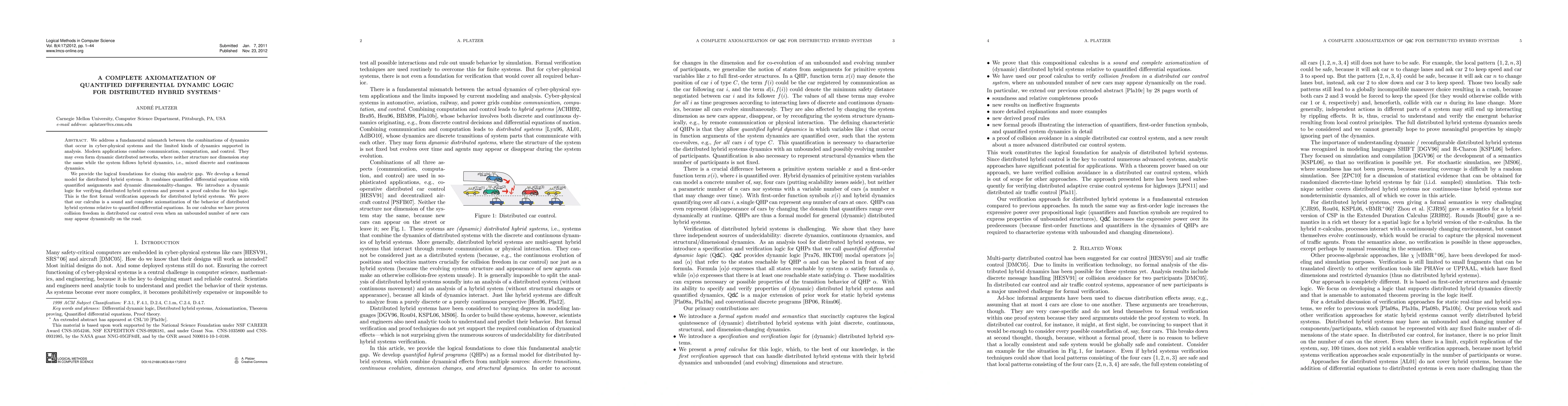 This paper presents a complete axiomatization for quantified differential dynamic logic to analyze distributed hybrid systems, combining communication, computation, and control. It introduces a formal model and proof calculus for verifying such systems, demonstrating its effectiveness through collision-free distributed car control scenarios.