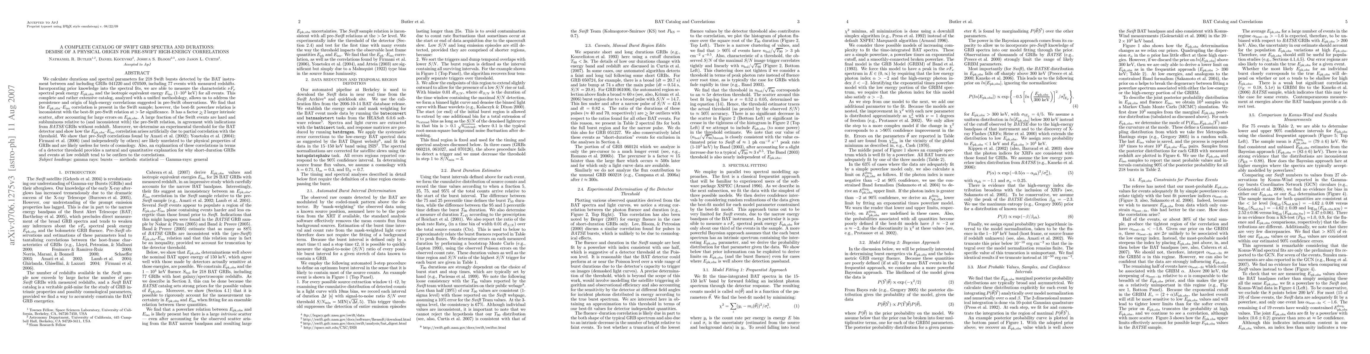 We calculate durations and spectral paramaters for 218 Swift bursts detected by the BAT instrument between and including GRBs 041220 and 070509, including 77 events with measured redshifts. Incorporating prior knowledge into the spectral fits, we are able to measure the characteristic $\nu F_{\nu}$ spectral peak energy $E_{\rm pk,obs}$ and the isotropic equivalent energy $E_{\rm iso}$ (1--$10^4$ keV) for all events. This complete and rather extensive catalog, analyzed with a unified methodology, allows us to address the persistence and origin of high-energy correlations suggested in pre-Swift observations. We find that the $E_{\rm pk,obs}$-$E_{\rm iso}$ correlation is present in the Swift sample; however, the best-fit powerlaw relation is inconsistent with the best-fit pre-Swift relation at >5 sigma significance. Moreover, it has a factor >~ 2 larger intrinsic scatter, after accounting for large errors on $E_{\rm pk,obs}$. A large fraction of the Swift events are hard and subluminous relative to (and inconsistent with) the pre-Swift relation, in agreement with indications from BATSE GRBs without redshift. Moreover, we determine an experimental threshold for the BAT detector and show how the $E_{\rm pk,obs}$--$E_{\rm iso}$ correlation arises artificially due to partial correlation with the threshold. We show that pre-Swift correlations found by Amati et al.(2002), Yonetoku et al. (2004), Firmani et al.(2006) (and independently by others) are likely unrelated to the physical properties of GRBs and are likely useless for tests of cosmology. Also, an explanation of these correlations in terms of a detector threshold provides a natural and quantitative explanation for why short-duration GRBs and events at low redshift tend to be outliers to the correlations.