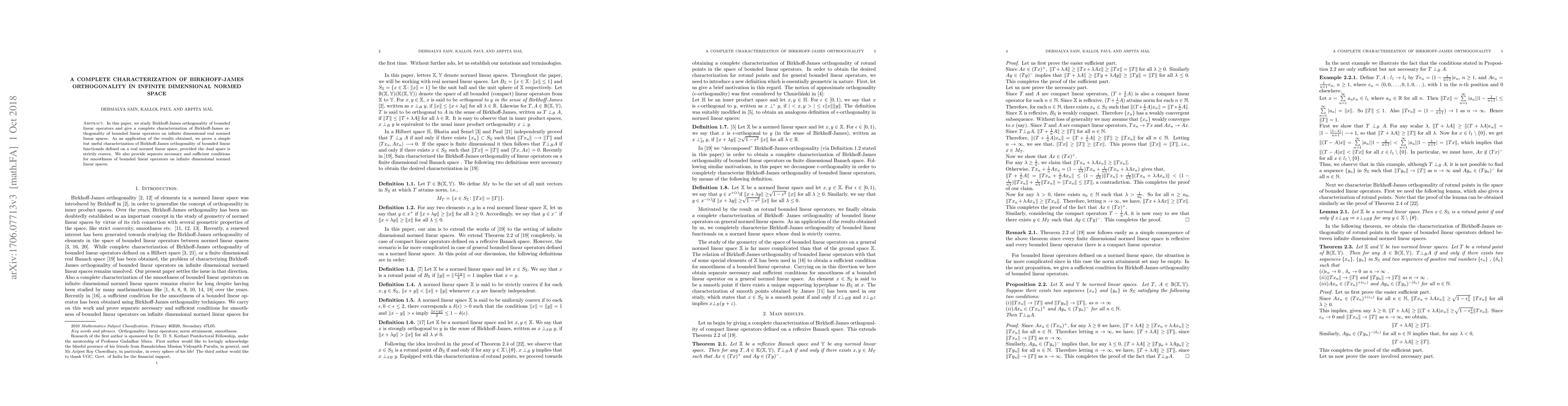 In this paper, we study Birkhoff-James orthogonality of bounded linear operators and give a complete characterization of Birkhoff-James orthogonality of bounded linear operators on infinite dimensional real normed linear spaces. As an application of the results obtained, we prove a simple but useful characterization of Birkhoff-James orthogonality of bounded linear functionals defined on a real normed linear space, provided the dual space is strictly convex. We also provide separate necessary and sufficient conditions for smoothness of bounded linear operators on infinite dimensional normed linear spaces.
