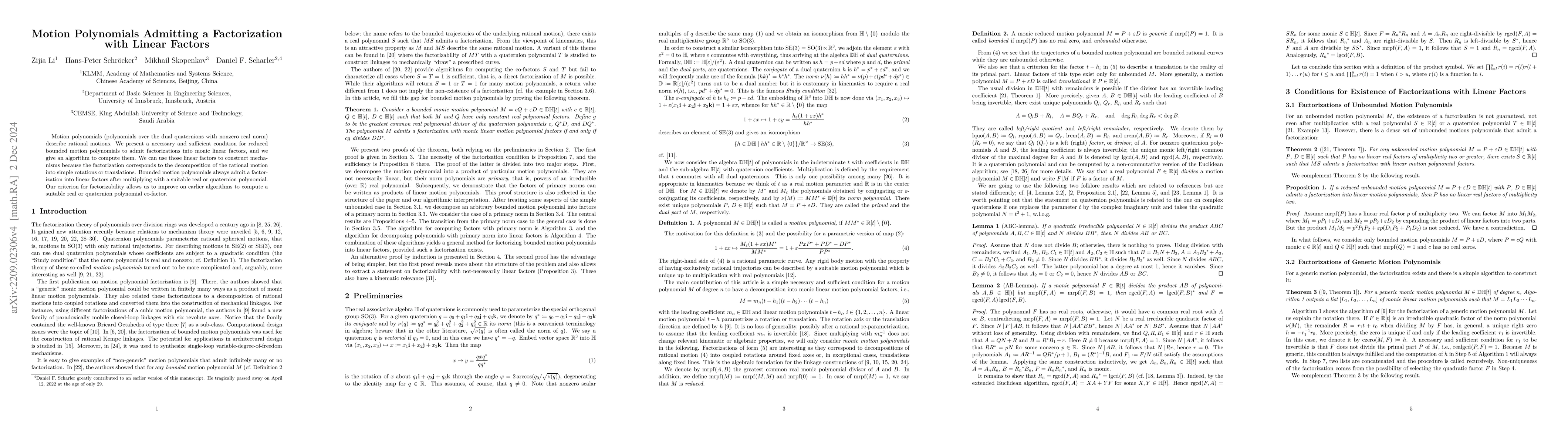 This paper characterizes bounded motion polynomials that can be factored into linear factors, providing a necessary and sufficient condition for such factorization. It also presents an algorithm for computing these factors, enabling the construction of mechanisms by decomposing rational motions into simple rotations or translations.