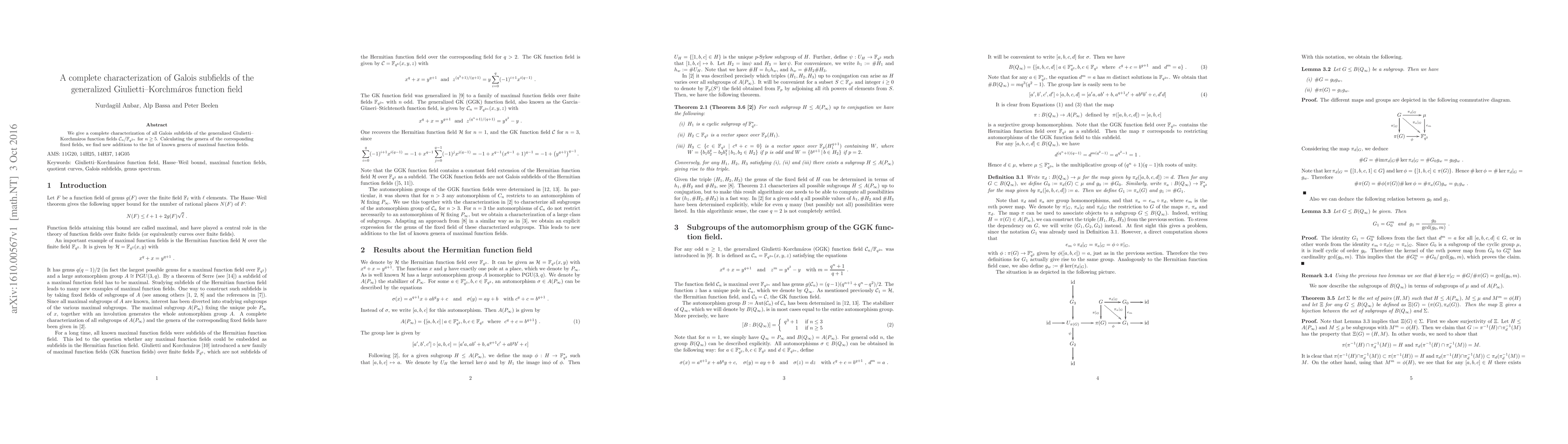 We give a complete characterization of all Galois subfields of the generalized Giulietti--Korchm\'aros function fields $\mathcal C_n / \fqn$ for $n\ge 5$. Calculating the genera of the corresponding fixed fields, we find new additions to the list of known genera of maximal function fields.
