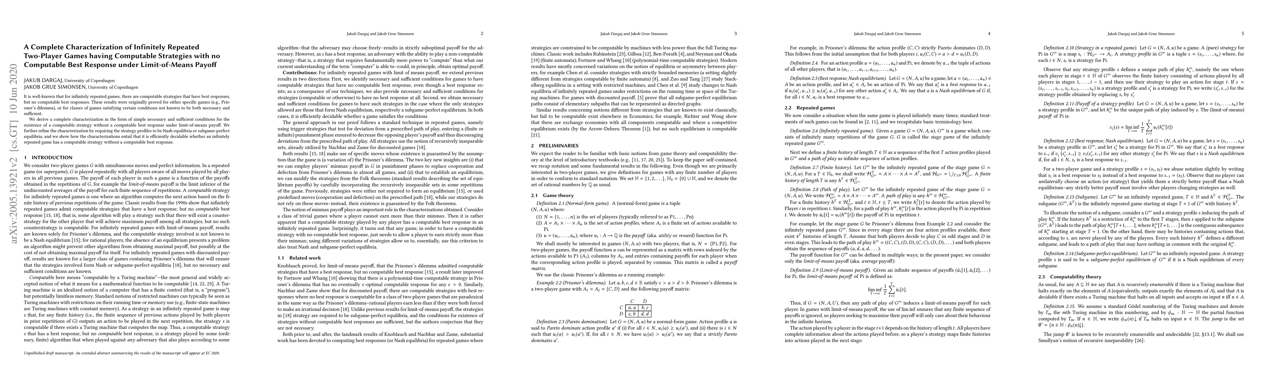 This paper provides a complete characterization of infinitely repeated two-player games where computable strategies exist without computable best responses under limit-of-means payoff. It establishes necessary and sufficient conditions for such scenarios and shows that determining their existence is efficiently decidable.