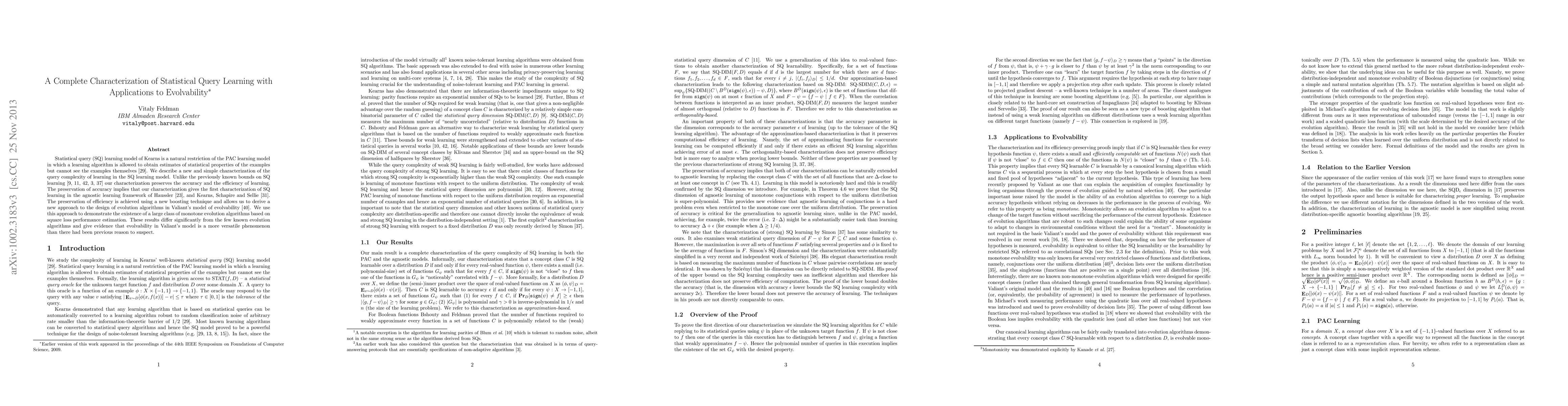 This research paper characterizes the statistical query learning model, preserving accuracy and efficiency, with implications for evolutionary algorithms in the context of evolvability, providing evidence that evolvability is a more versatile phenomenon than previously thought.
