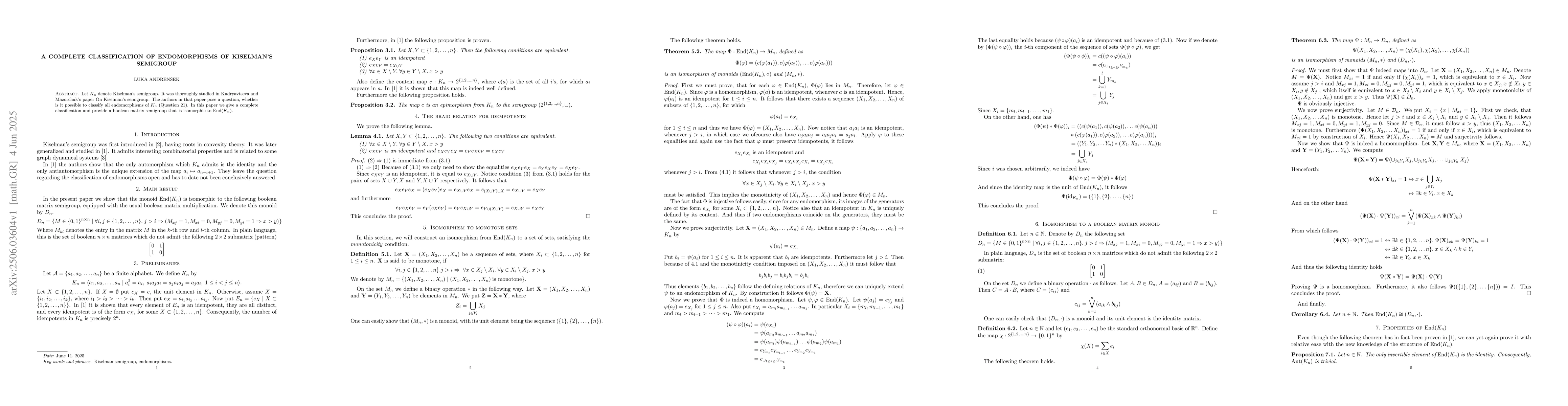 Let $K_n$ denote Kiselman's semigroup. It was thoroughly studied in Kudryavtseva and Mazorchuk's paper On Kiselman's semigroup. The authors in that paper pose a question, whether it is possible to classify all endomorphisms of $K_n$ (Question 21). In this paper we give a complete classification and provide a boolean matrix semigroup that is isomorphic to End$(K_n)$.