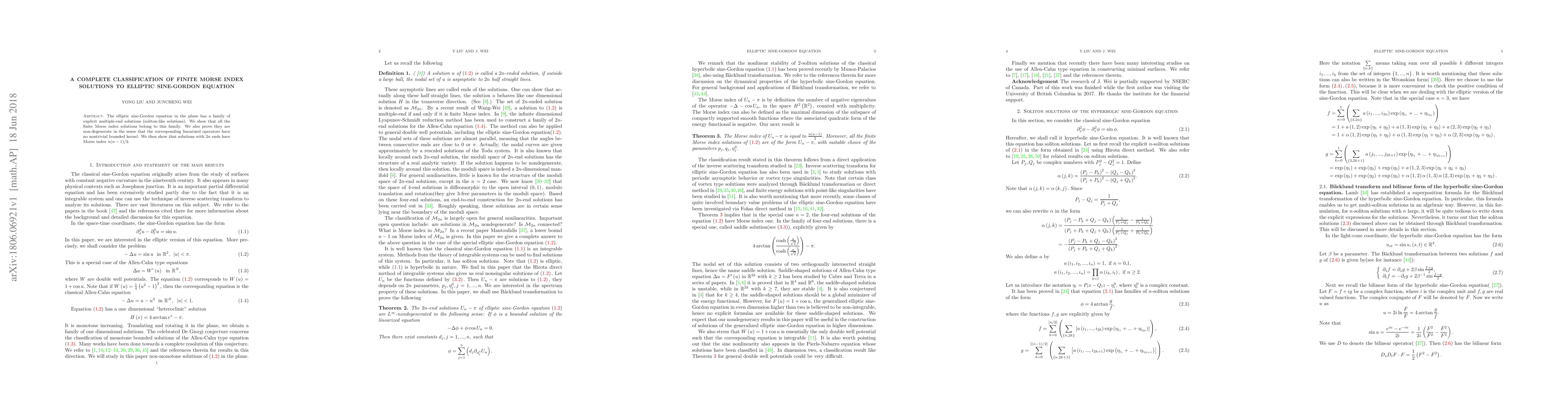 This paper classifies finite Morse index solutions to the elliptic sine-Gordon equation in the plane, demonstrating that all such solutions are multiple-end soliton-like and non-degenerate. It also establishes that solutions with $2n$ ends have a Morse index of $n(n-1)/2$.