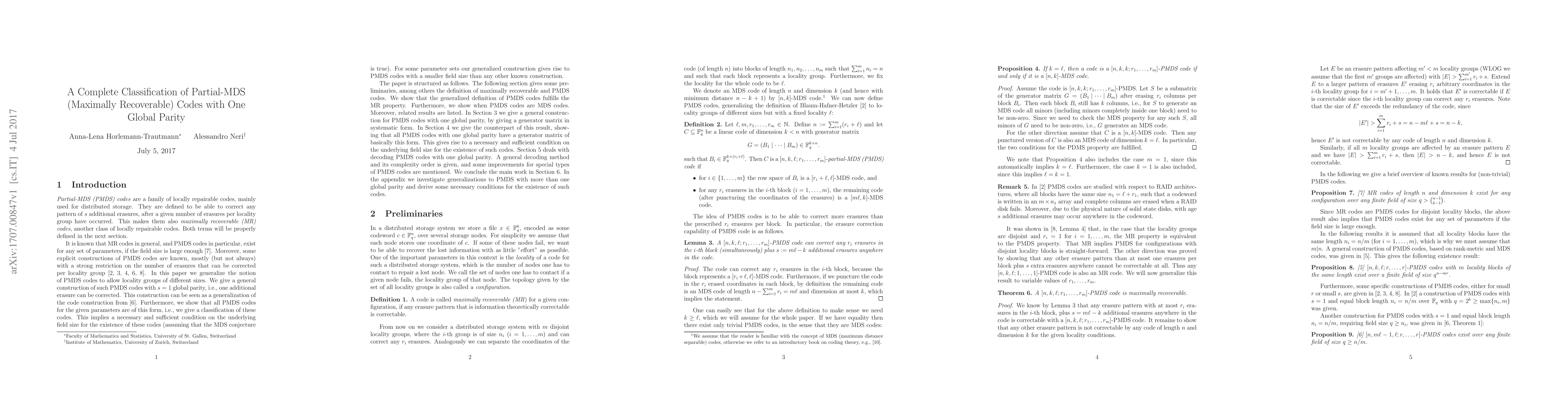 This paper classifies partial-MDS codes with one global parity, showing that all such codes can be constructed with a generalized approach allowing different locality group sizes. The study provides a necessary condition for the existence of these codes based on the underlying field size.