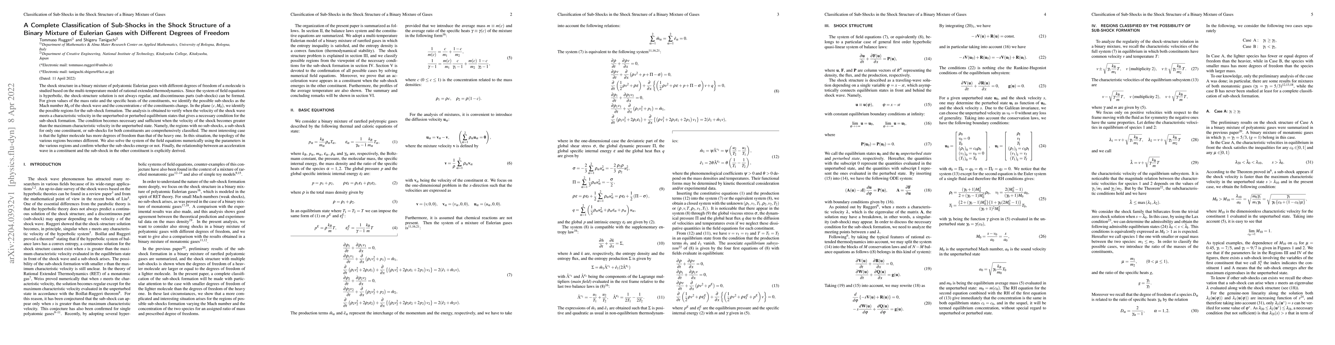 The shock structure in a binary mixture of polyatomic Eulerian gases with different degrees of freedom of a molecule is studied based on the multi-temperature model of rational extended thermodynamics. Since the system of field equations is hyperbolic, the shock-structure solution is not always regular, and discontinuous parts (sub-shocks) can be formed. For given values of the mass ratio and the specific heats of the constituents, we identify the possible sub-shocks as the Mach number $M_0$ of the shock wave and the concentration $c$ of the constituents change. In the plane $(c,M_0)$, we identify the possible regions for the sub-shock formation. The analysis is obtained to verify when the velocity of the shock wave meets a characteristic velocity in the unperturbed or perturbed equilibrium states that gives a necessary condition for the sub-shock formation. The condition becomes necessary and sufficient when the velocity of the shock becomes greater than the maximum characteristic velocity in the unperturbed state. Namely, the regions with no sub-shocks, a sub-shock for only one constituent, or sub-shocks for both constituents are comprehensively classified. The most interesting case is that the lighter molecule has more degrees of freedom than that of the heavy one. In this situation, the topology of the various regions becomes different. We also solve the system of the field equations numerically using the parameters in the various regions and confirm whether the sub-shocks emerge or not. Finally, the relationship between an acceleration wave in a constituent and the sub-shock in the other constituent is explicitly derived.