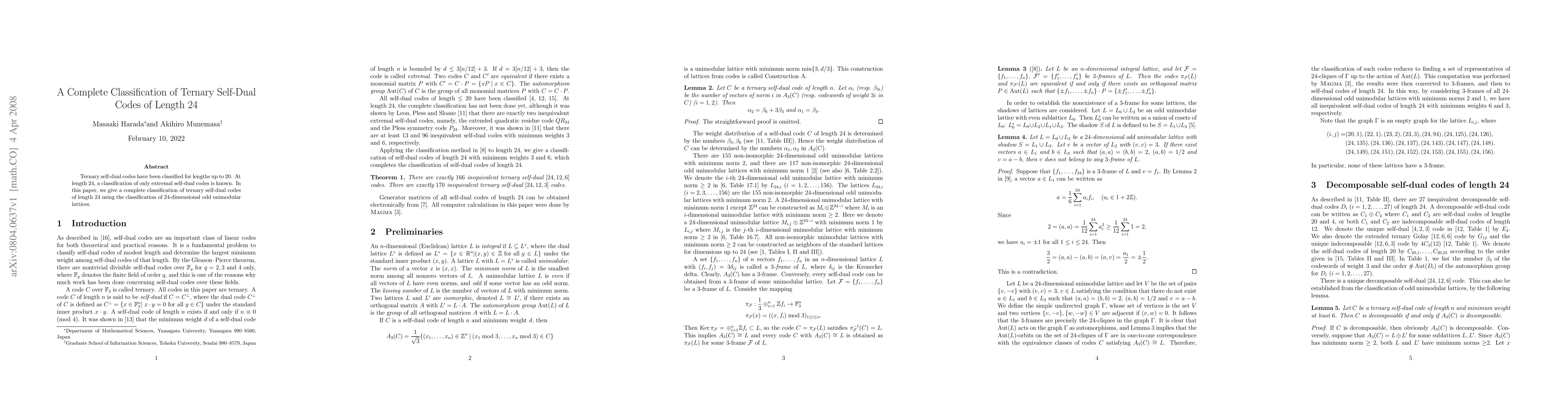 This paper provides a complete classification of ternary self-dual codes of length 24, extending previous classifications up to length 20. It leverages the classification of 24-dimensional odd unimodular lattices to achieve this comprehensive categorization.