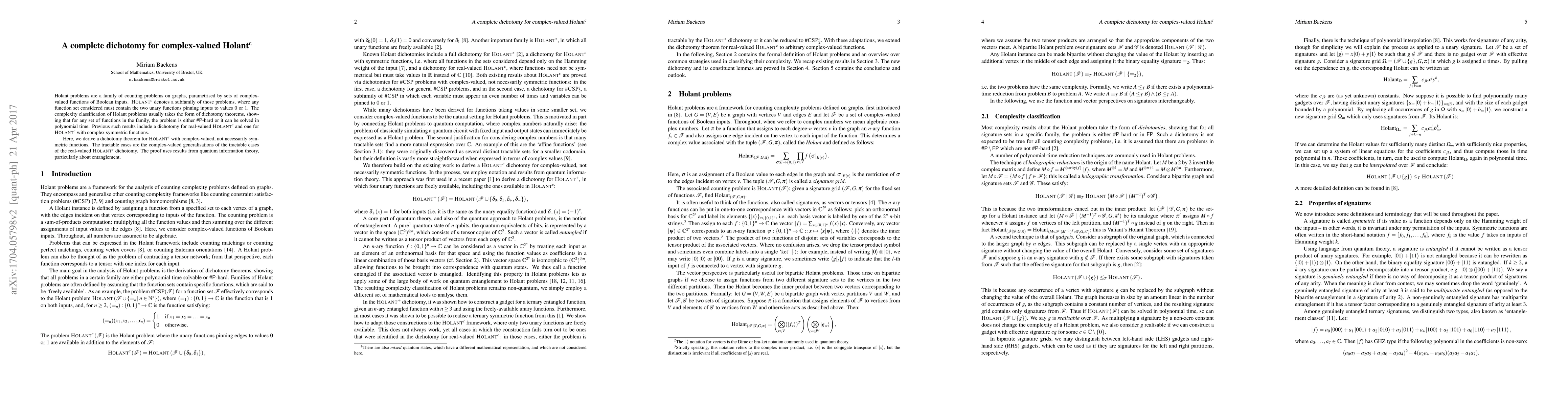 This paper establishes a dichotomy theorem for Holant^c problems involving complex-valued functions, showing that such problems are either #P-hard or solvable in polynomial time. The tractable cases mirror the real-valued counterparts, with the proof leveraging insights from quantum information theory and entanglement.