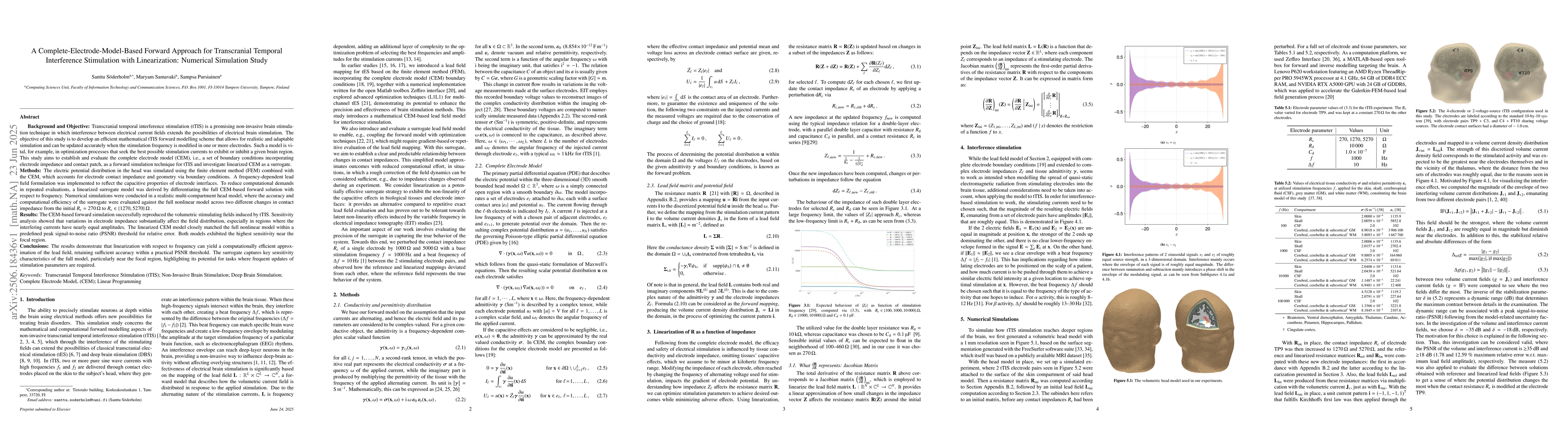 This study develops a mathematical model for Transcranial Temporal Interference Stimulation (tTIS), considering electrode impedance and contact. The Complete Electrode Model (CEM) accurately simulates volumetric stimulating fields, showing significant sensitivity to electrode impedance changes. A linearized CEM model, closely matching the full nonlinear model, is proposed for efficient optimization of brain stimulation.