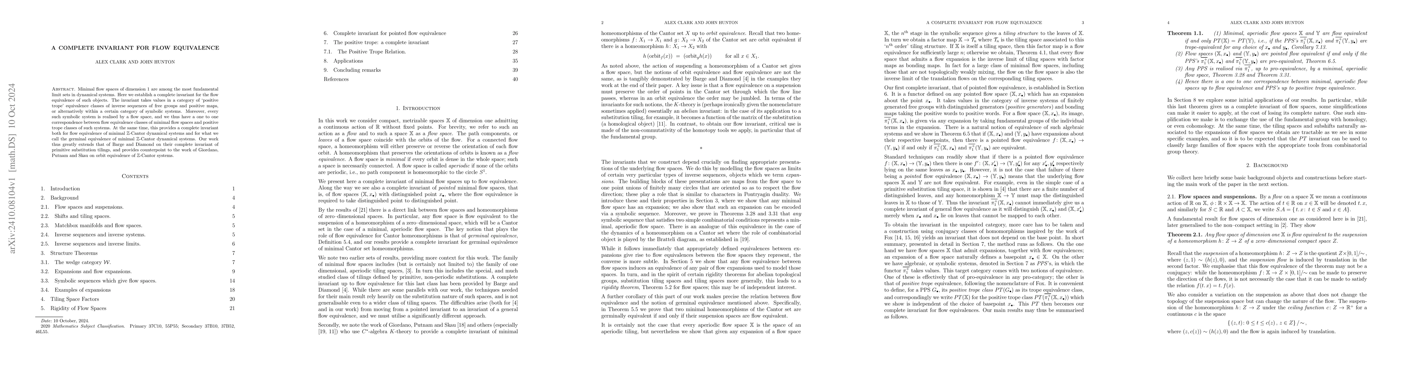 Minimal flow spaces of dimension 1 are among the most fundamental limit sets in dynamical systems. Here we establish a complete invariant for the flow equivalence of such objects. The invariant takes values in a category of `positive trope' equivalence classes of inverse sequences of free groups and positive maps, or alternatively within a certain category of symbolic systems. Moreover, every such symbolic system is realised by a flow space, and we thus have a one to one correspondence between flow equivalence classes of minimal flow spaces and positive trope classes of such systems. At the same time, this provides a complete invariant both for flow equivalence of minimal Z-Cantor dynamical systems and for what we call the germinal equivalence of minimal Z-Cantor dynamical systems. Our work thus greatly extends that of Barge and Diamond on their complete invariant of primitive substitution tilings, and provides counterpoint to the work of Giordano, Putnam and Skau on orbit equivalence of Z-Cantor systems.