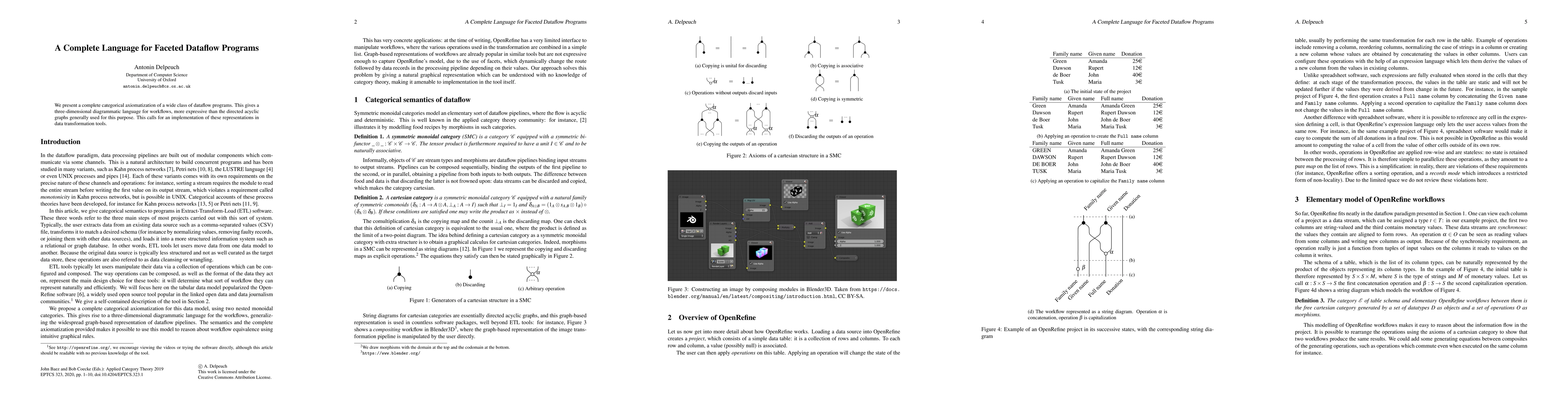 We present a complete categorical axiomatization of a wide class of dataflow programs. This gives a three-dimensional diagrammatic language for workflows, more expressive than the directed acyclic graphs generally used for this purpose. This calls for an implementation of these representations in data transformation tools.
