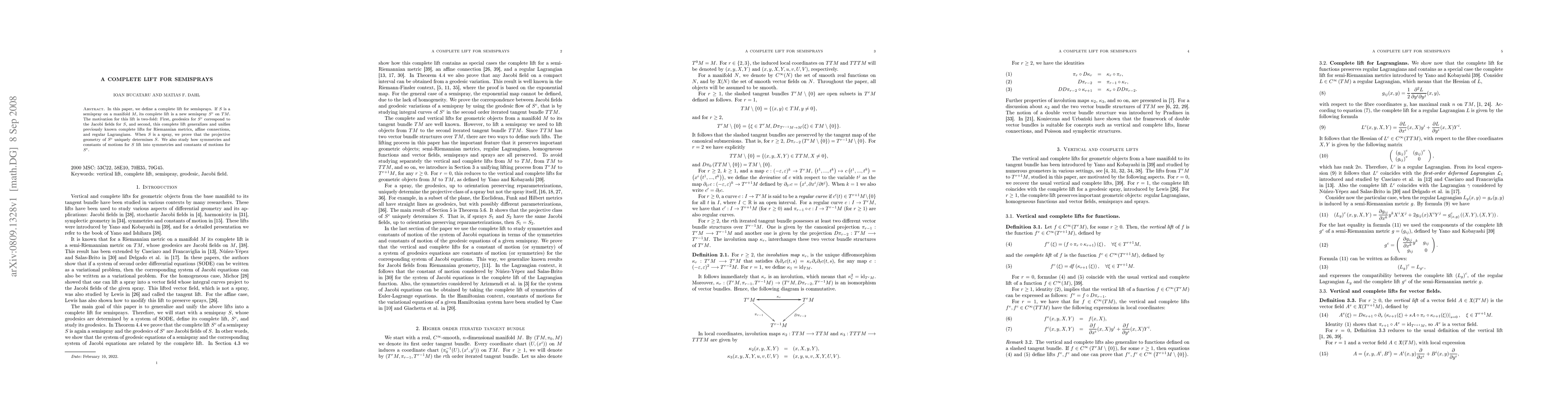 In this paper, we define a complete lift for semisprays. If $S$ is a semispray on a manifold $M$, its complete lift is a new semispray $S^c$ on $TM$. The motivation for this lift is two-fold: First, geodesics for $S^c$ correspond to the Jacobi fields for $S$, and second, this complete lift generalizes and unifies previously known complete lifts for Riemannian metrics, affine connections, and regular Lagrangians. When $S$ is a spray, we prove that the projective geometry of $S^c$ uniquely determines $S$. We also study how symmetries and constants of motions for $S$ lift into symmetries and constants of motions for $S^c$.