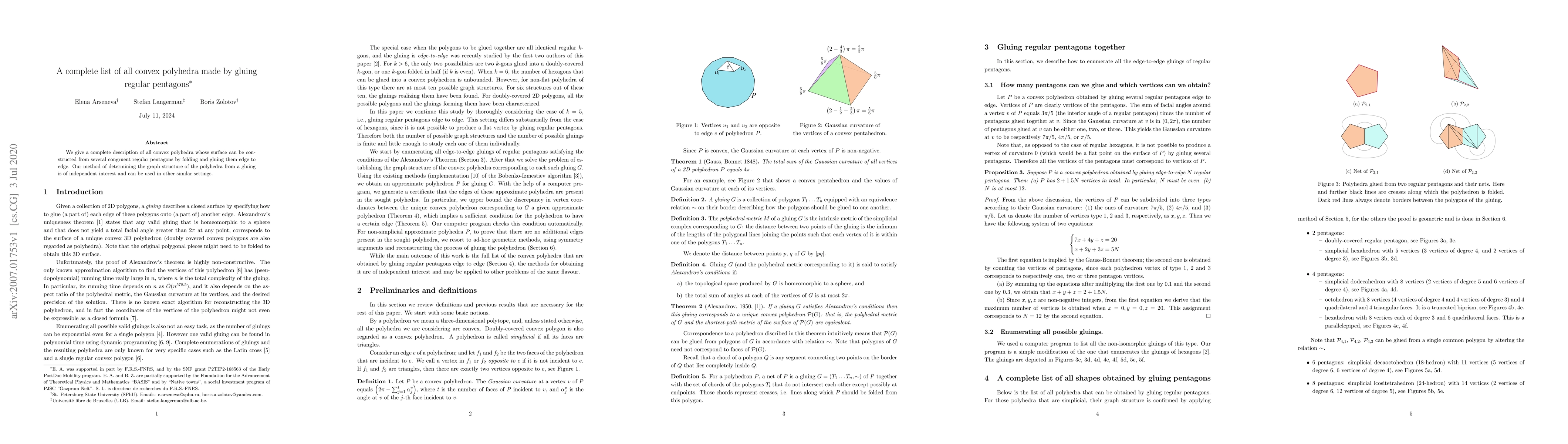 This research provides a comprehensive enumeration of all convex polyhedra formed by gluing several congruent regular pentagons together. The method used to determine the polyhedra's graph structure from their gluing pattern is also significant and applicable to other geometric contexts.